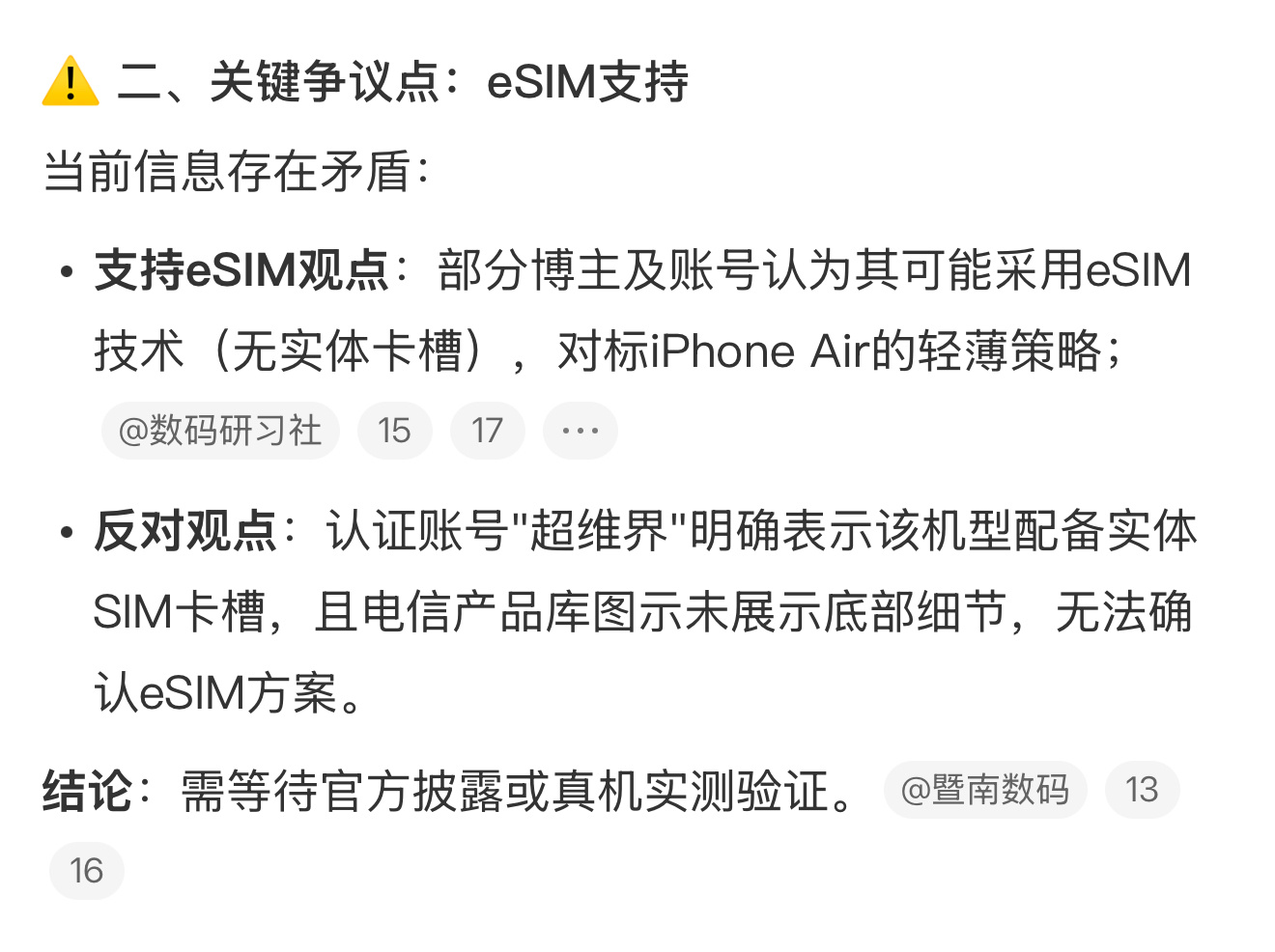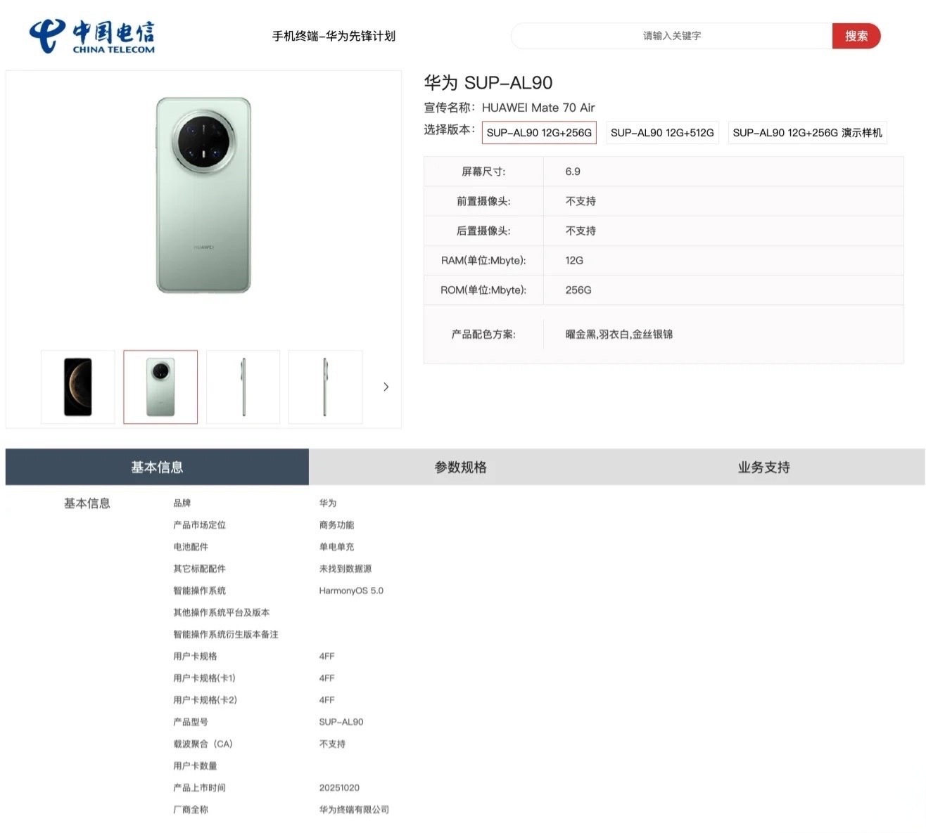 华为Mate 70 Air手机,今日已上架电信终端产品库,内置HarmonyOS 5.0,是否采用eSIM方案尚未在备案信息中明确标注,外界对此存在不同猜测,有人认为支持,也有人认为不支持。