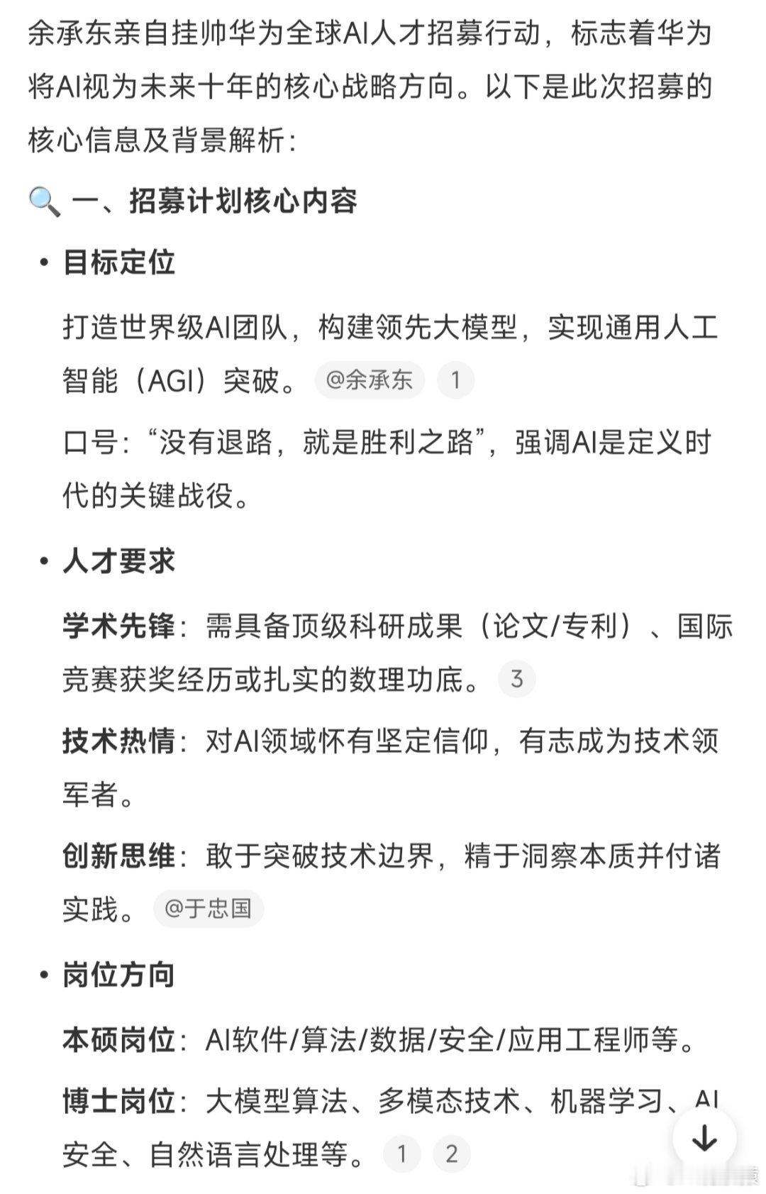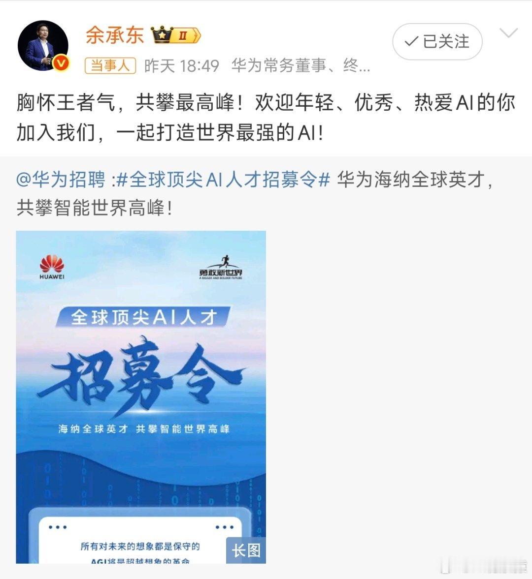 余承东亲自招募全球顶尖AI人才余承东:打造世界级AI团队,构建领先大模型,实现通用人工智能(AGI)突破。
