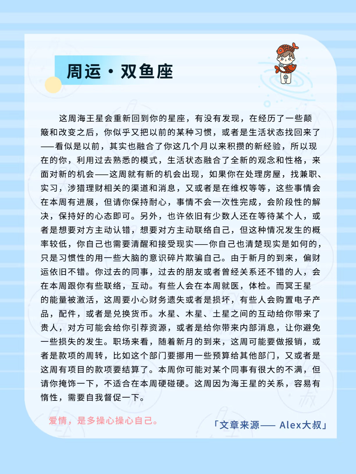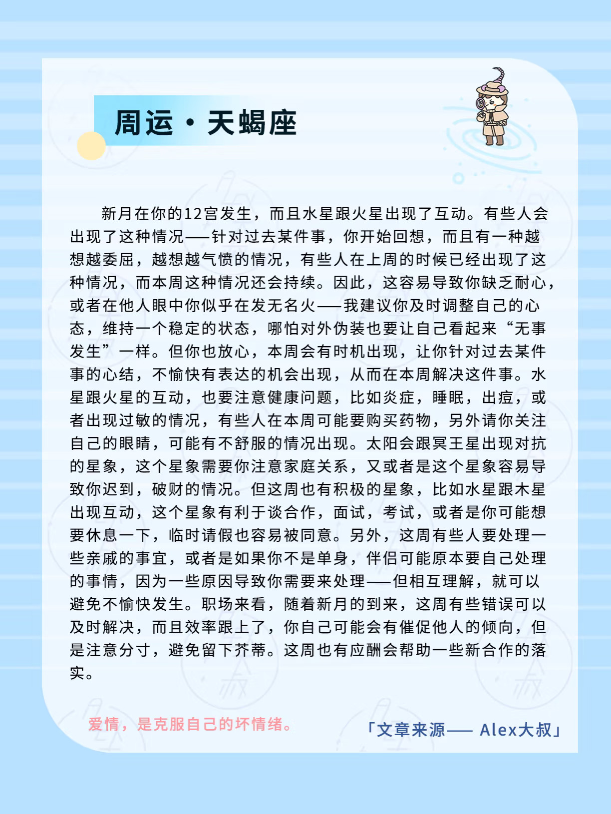 太阳也会在本周来到新的位置,而且太阳会跟冥王星出现对抗的星象。这两组星象会帮助我们看到别人露出的马脚,找到破绽,在工作或者其他事情上,有助于我们打翻身仗,也可以帮助我们去戳破一些谎言。在这些星象的影响下,可能也会帮助我们撕开别人伪装的面具——也许本周可能一些人就是会翻脸,就是会吵架,但这种冲突时刻未必是坏事,相反也是保护我们,及时去解决问题,甚至是改变局面的有利时机。