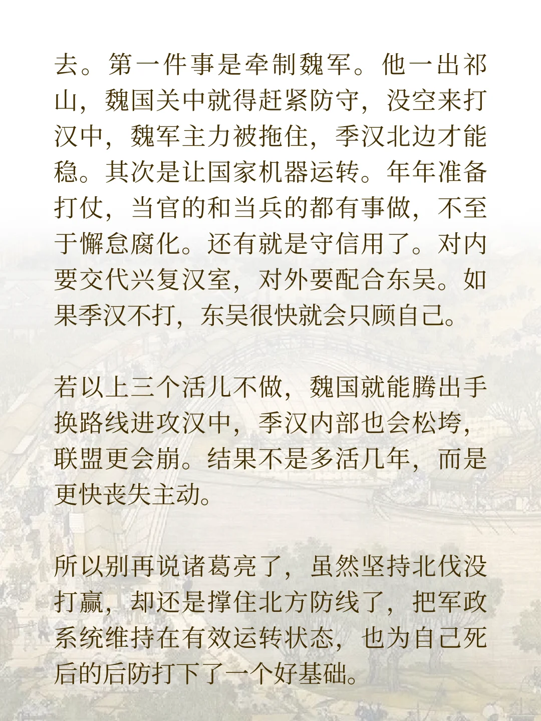 很多人一提季汉灭亡,就把锅全丢给诸葛亮和姜维,觉得一个穷打祁山,一个疯打陇右,活活把季汉折腾没了。可我越往回翻史书,越发现一件挺反直觉的事:就算他们俩都不打,季汉还是一样要亡,而且可能亡得更快。