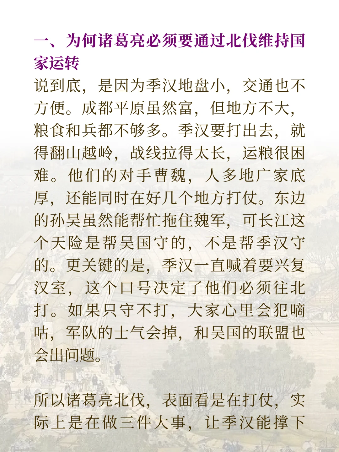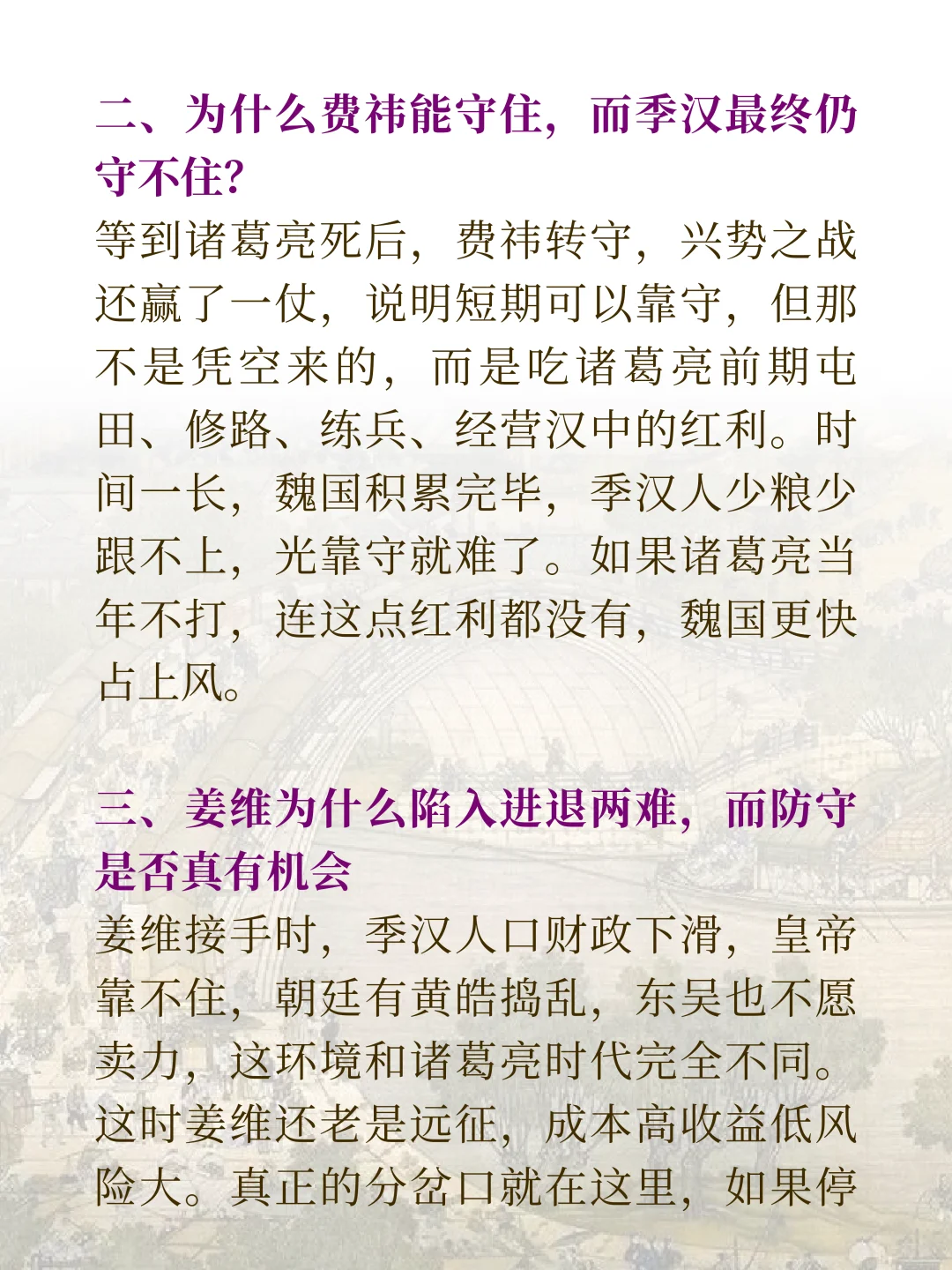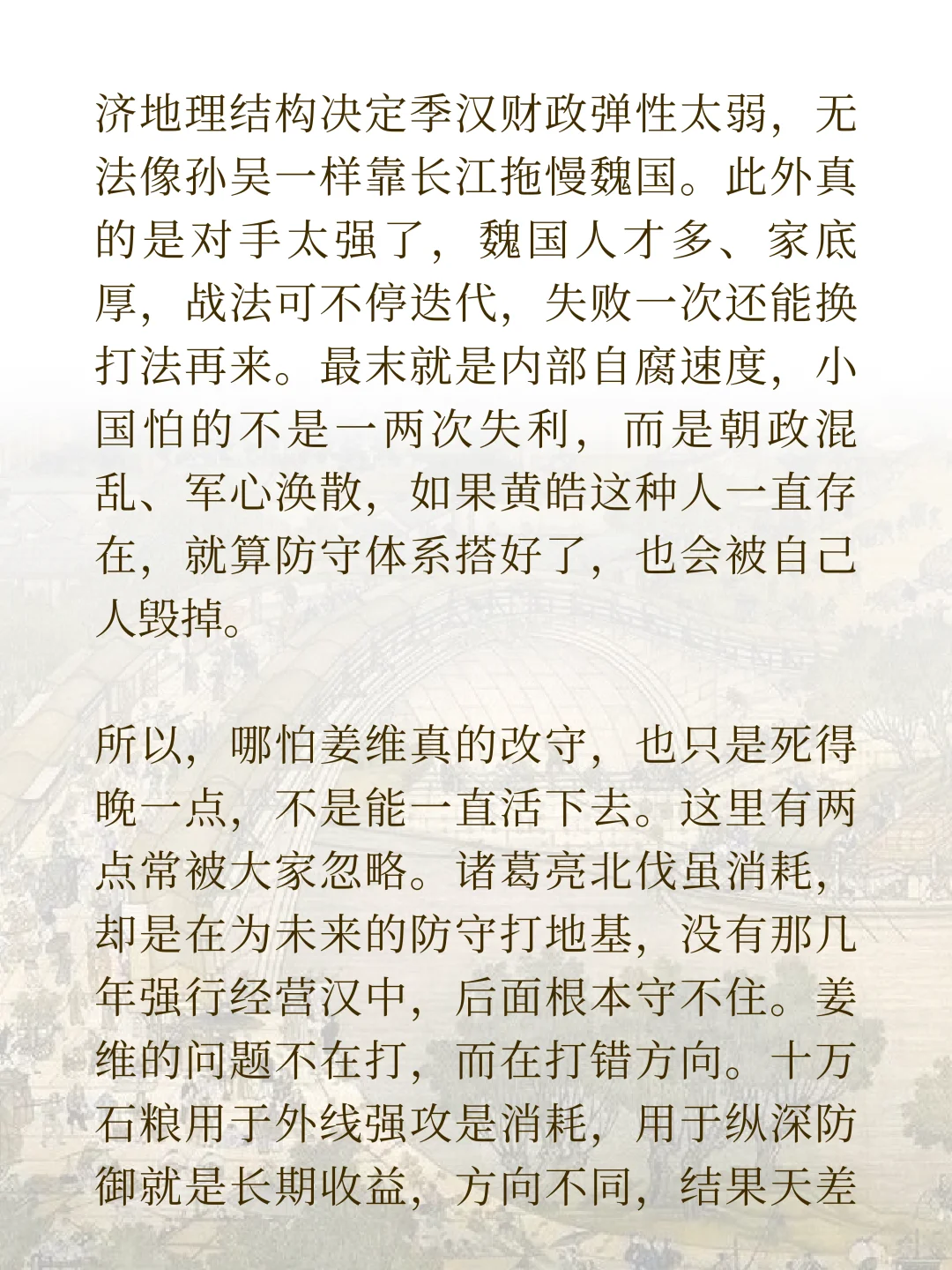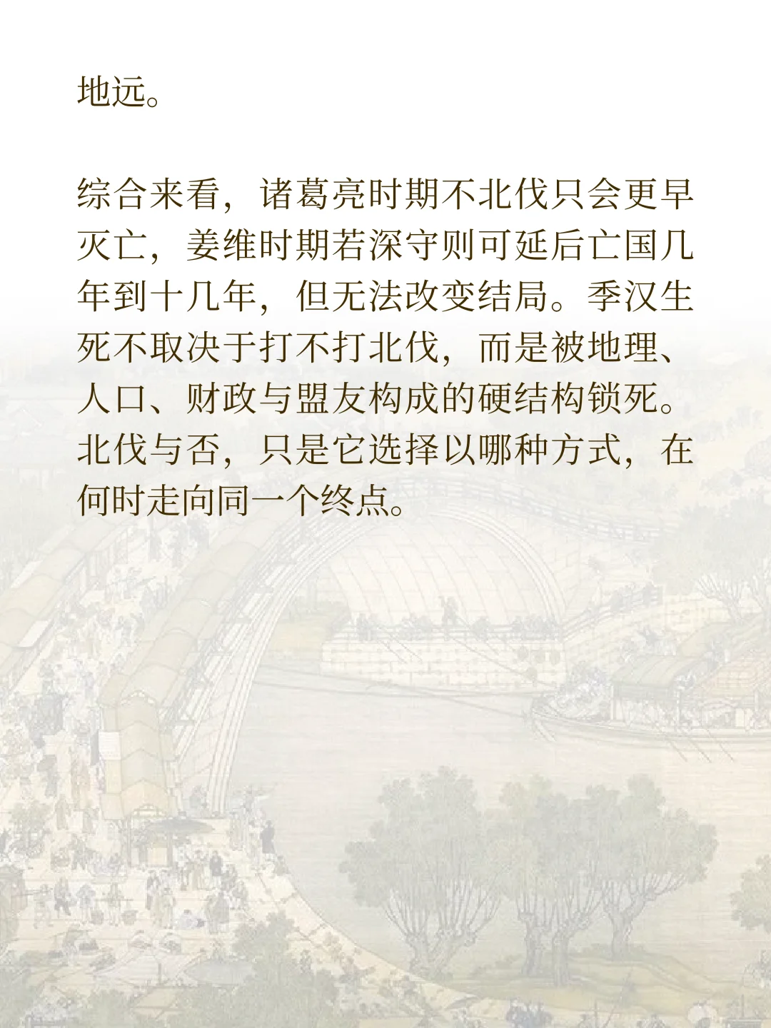 季汉的根本问题从来不在战场上,而是在地形、人口和国力这些天生短板上。它像被关在一个只能自循环的小盒子里,不打会闷死,打又永远透不过气。所以诸葛亮的北伐,很多时候不是要赢,而是为了维持国家还能继续运转。到了姜维那里,环境更烂、人心更散,就算他停下刀兵,也只是把速死拖成慢死。