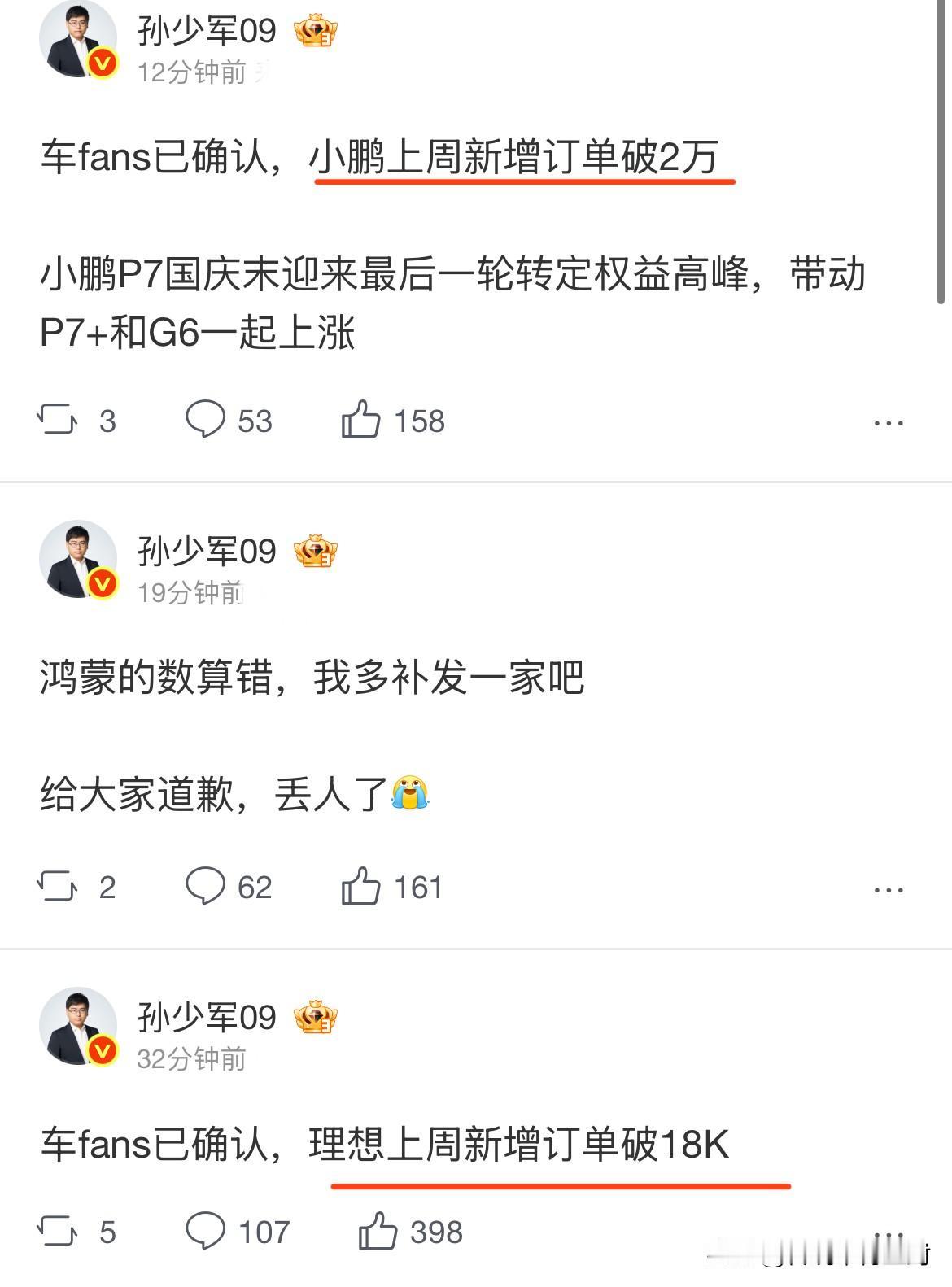 上周订单战报来了。 这次少军报了4家的,因为包含假期最后6、7、8三天,所以各家都还不错,环比持平或微涨,这样大家也可以算出最近半个月热门新势力品牌的订单水平。 上周订单表现最好的,毫无疑问还是鸿蒙智行,破了35k,这是真的“遥遥领先”,百万豪车尊界继续超800,品牌立住了。 其次竟然是小鹏,超20k,说实话有点意外,按照少军的说法是新P7转定高峰和P7+、G6的上涨,对小鹏来说应该算是理想的局面。 然后就是理想和零跑,分别破了18k和17k,都蛮好的,理想的i6应该是表现非常出色的。 整体来看,就像我之前说的,热门新势力品牌的马太效应正在显现……