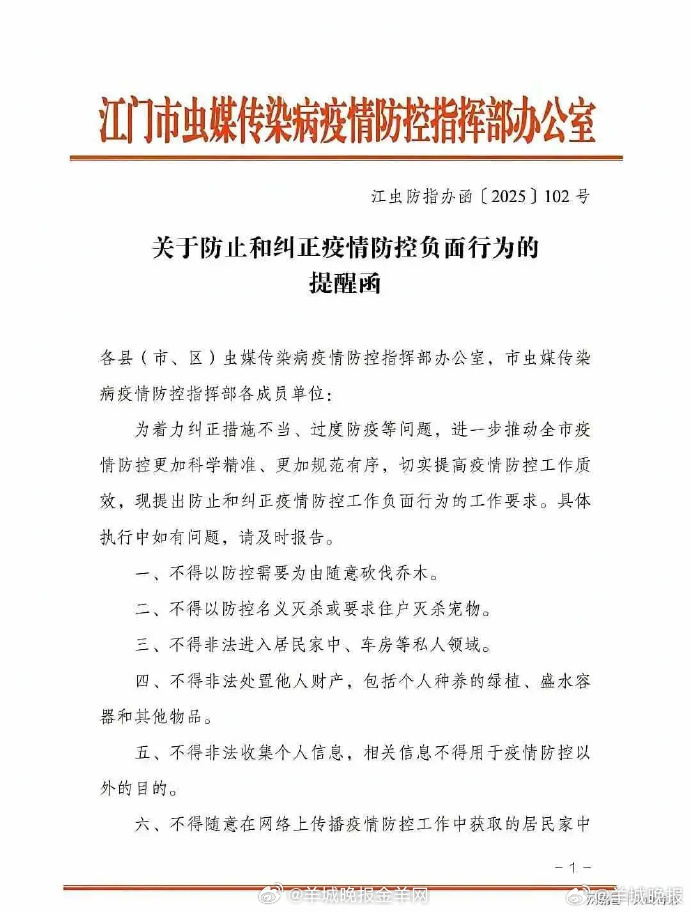 #江门发布疫情防控负面清单# 【明确22个“不”!江门发布防控“负面清单” 为基层防疫工作划红线|鱼眼·热点】疫情防控进入关键阶段,江门市近期发布《关于防止和纠正疫情防控负面行为的提醒函》(江虫防指办函〔2025〕102号),以22个“不”的明确禁令划定防疫工作红线。据记者采访及相关信息梳理,这22条规定本质上是一份内部规范流程,核心针对基层工作人员及参与防控的组织方,通过明确操作注意事项,确保防控工作既符合群众利益,又遵循规范流程,推动疫情防控更加科学有序,助力早日实现全面清零目标。