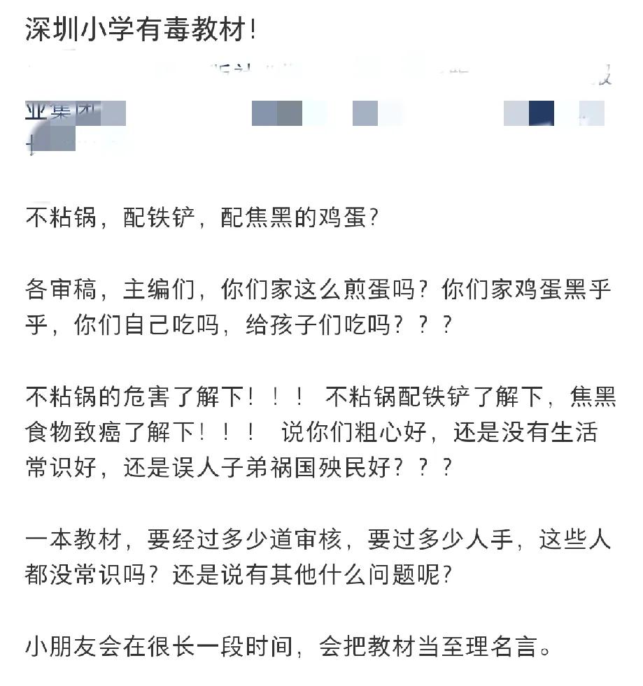 深圳一家长吐槽小学教材有毒 误人子弟 原因是劳动实践这本教材 里面有一部分是讲煎鸡蛋的过程 然后家长觉得配图里面,不粘锅配铁铲不合理,鸡蛋煎的都黑了 因为不粘锅的涂层有毒,铁铲很容易破坏这个涂层,吃了会伤害身体 这个家长的想法有一定道理,但并不完全对 首先铁铲确实会更容易破坏不粘锅的涂层,比较建议使用木铲或硅胶铲 但是这个涂层本身并不会伤害到人体,铁铲只是降低了耐用性,只有长时间干烧,超过涂层耐热,使其分解出有毒气体 才会对人体有害 最后鸡蛋偏黑是因为加了酱油,煎鸡蛋加点酱油确实好吃 教材乱象 教材问题