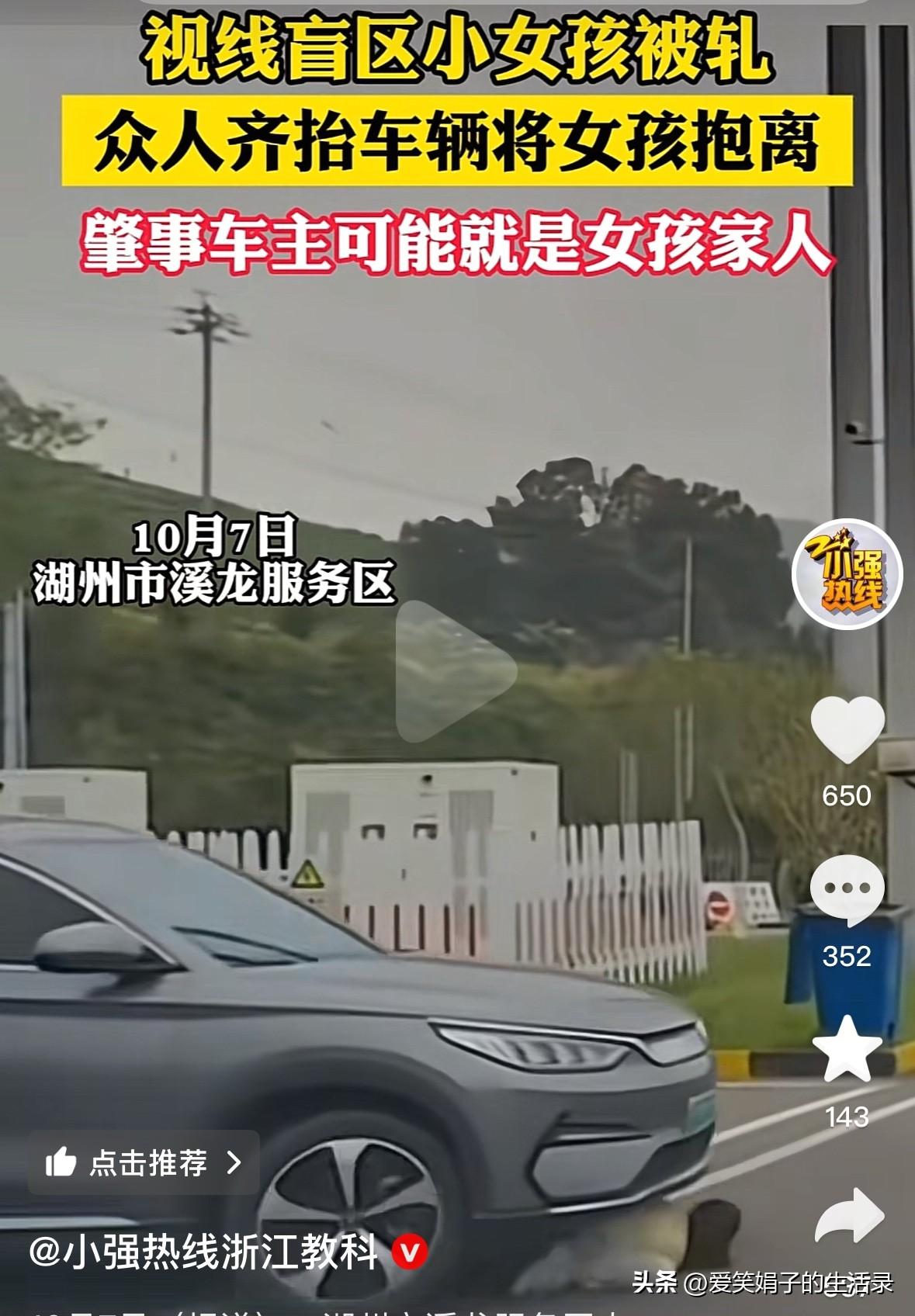 太可怕了!湖州市溪龙服务区,一女孩蹲在车头处玩耍,不料遭汽车碾压,所幸遇到好心人
