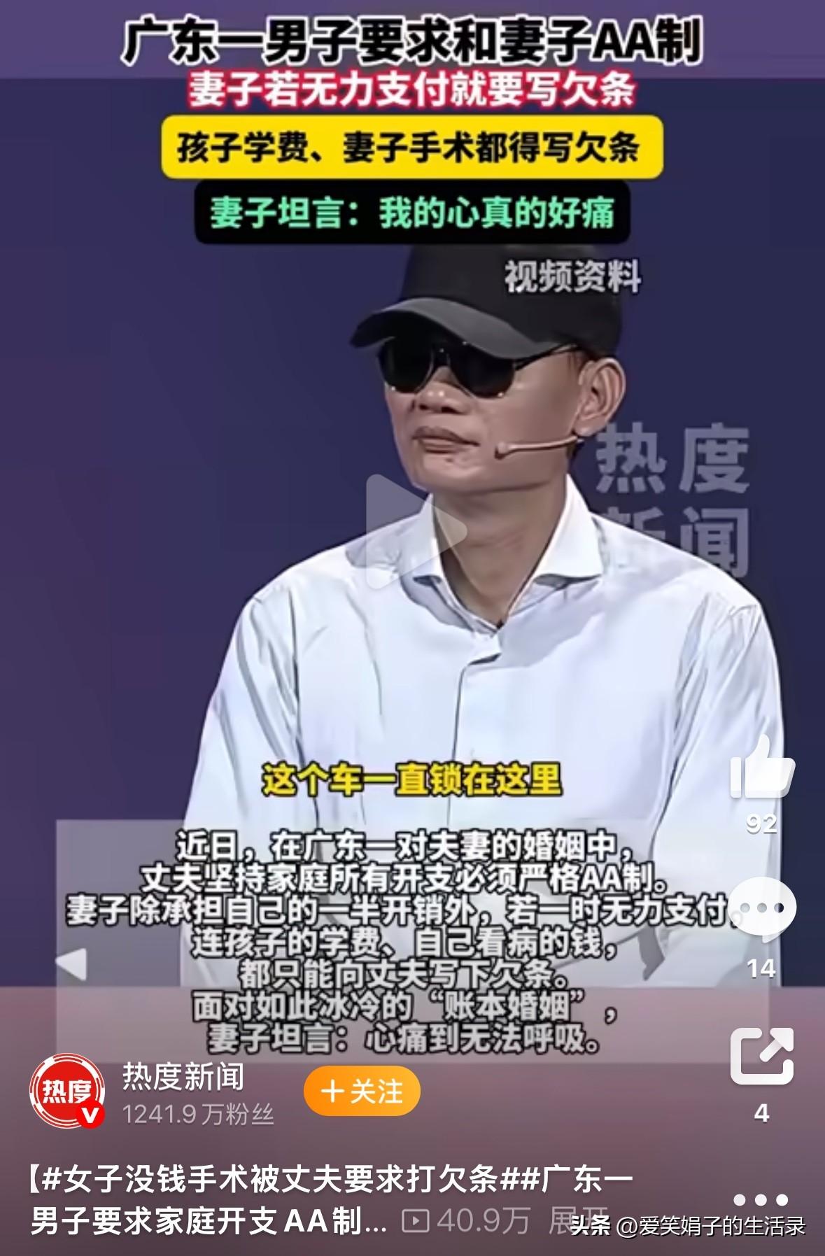 近日,广东一男子要求和妻子AA制,他表示家里所有大小开支必须严格执行AA。如果妻子无力支付,连孩子的学费以及自己看病的医药费,都要给他写欠条。 对于这样的婚姻,妻子坦言:心痛到无法呼吸! 看到这则新闻,实在是令人心寒。这两口子过日子,连买菜钱都要掰扯清楚,妻子拿不出还要写欠条,听着就心凉。 人家说夫妻是“搭伙过日子”,但这伙搭得比外人还生分——你做饭我洗碗是情分,可到他这儿,连呼吸都得算AA吧? 最扎心的是,妻子不是不想出钱,是真没那个能力。婚姻该是互相帮衬的暖窝,不是算得明明白白的生意场。 要是连另一半难的时候都不肯拉一把,这婚结得,还不如自己过舒坦呢!