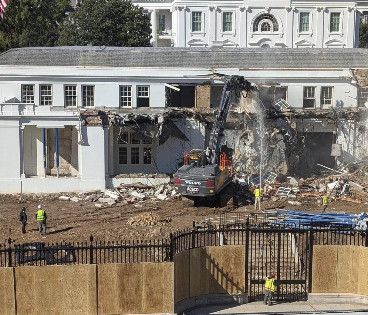 施工人员正在拆除白宫东翼的一部分建筑,以便为特朗普计划修建造价 2.5 亿美元、面积达 9 万平方英尺(约8361平方米)的宴会大厅腾出空间。