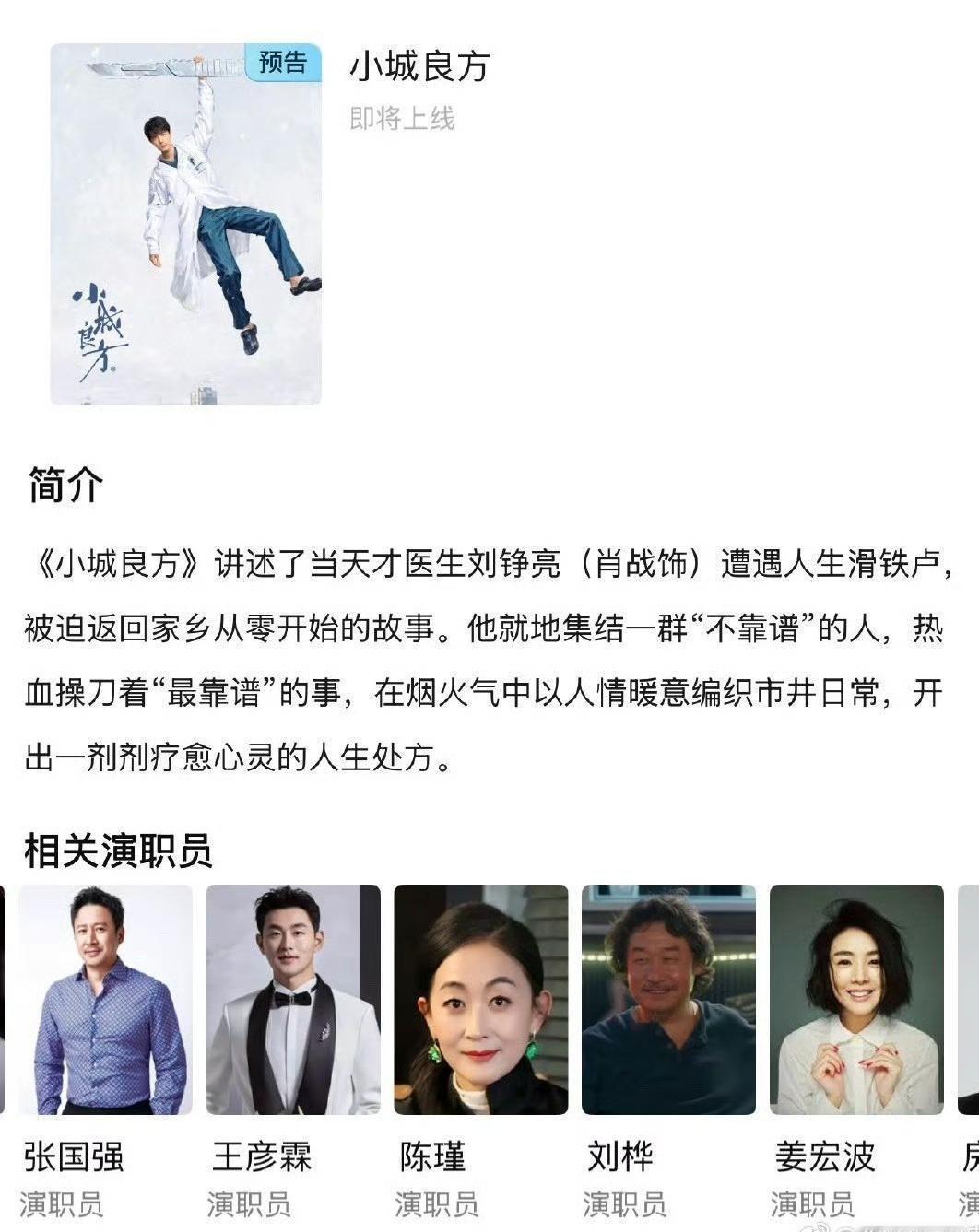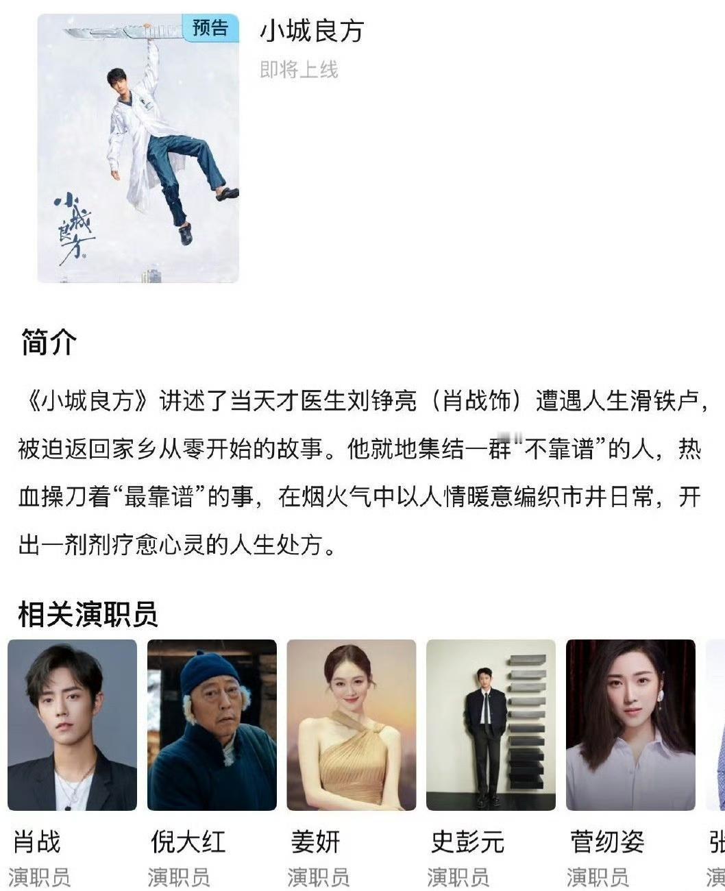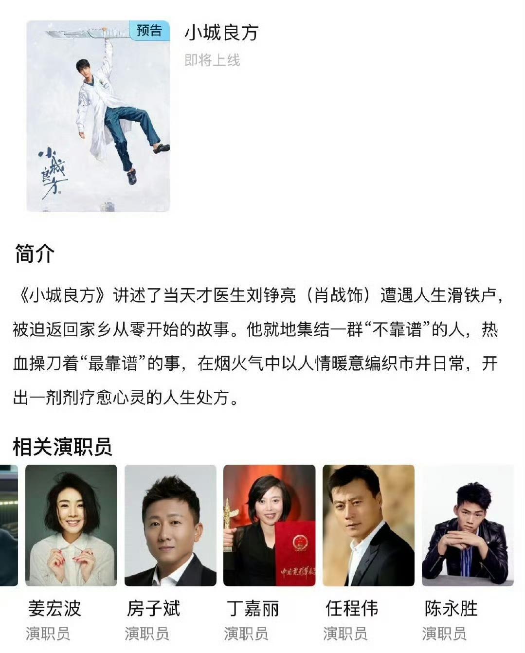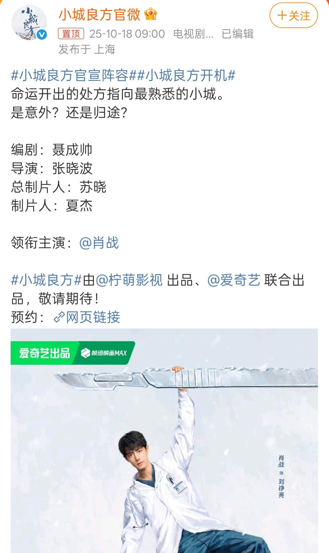 《小城良方》今日开机,官博第一条微博只发了肖战,班底阵容非常强大,主演阵容:姜研,倪大红,史彭元、菅纫姿、张国强、王彦霖! 实力配角:郭涛、陈瑾、刘桦、姜宏波等,饰演基层医院同事及小城居民。看来柠檬大厂为了让肖战接戏展现了最大的诚意! 从今天官宣的海报上来看,这个洞洞鞋也太接地气了吧哈哈哈!手术室标配,主要是这鞋穿着舒服,还有就是它皮实啊,适合消毒! 讲真,虽然还没开拍我已经非常期待小城良方了! 13个人里10个都是东北人 感觉在组里要被腌入味了!肖战被一群东北人环绕,不知道他拍完会不会说话一股大碴子味,哈哈哈哈! 看来肖战今年又是腾飞的一年呀!年初《射雕英雄传》拿下武侠片票房史冠、春节档预售冠军、打破泰国马来西亚海外多国多地区票房等多项纪录,流媒体上线以来拿下多个地区冠军,CCTV6上线后首播收视破2夺冠。 年中《藏海传》大爆特爆,杀入全球百大电视剧(上一部上榜中国电视剧还是肖战2019年的《陈情令》),iMdb 9.5中剧最高分,收视率近两年第一、播放量平台冠军等等好成绩,上浮市场爆了口碑,下沉市场爆了热度,平台招商爆成史无前例,文化输出方面爆成国剧标杆。 《藏海传》刚开播,5月底就进组正午阳光出品的谍战大戏《谍报上不封顶》,9月底刚刚杀青又即将马不停蹄进组柠萌影视出品的现实主义医疗大剧《小城良方》。全都是超强阵容豪华班底配置。真是大剧连连看,全都看肖战啊! 《小城良方》定位:S级重点项目!导演:张晓波(代表作《三十而已》《猎罪图鉴》),擅长现实题材与黑色幽默风格。编剧:聂成帅(代表作《天才基本法》《大考》),剧本打磨超1年,聚焦基层医疗困境! 这样的组合堪称品质保证。剧集改编自刘三叔的小说《飞刀》,其他配角倾向于选用东北籍演员,以强化地域特色,看来故事底子相当扎实。 肖战这次演的是个医生,据说这个角色超级难演,是介于天才和疯子之间这么一个角色,肖战一脸高智感,感觉就很适合演医生的感觉:顶尖医生因为事故去了东北小城基层医院,带着“不靠谱”团队用黑色幽默聊生死,还要应付奇葩病例,甚至被殡葬店女老板倒追…… 《小城良方》虽是医疗题材但更深一层是在小城年轻人对大城市和家乡的选择困境,在当今环境下选择拍摄是很有现实意义并引发共鸣的。"良方"不只是开给病人,更是开给每一个此刻正在迷茫的观众!
