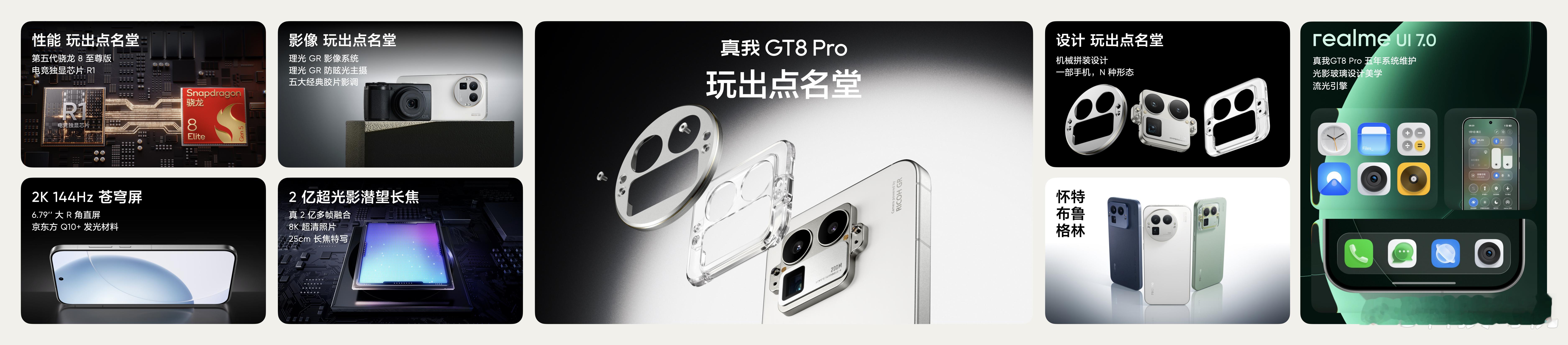 机械拼装设计,搭载第五代骁龙8至尊版和电竞独显芯片R1。理光GR联名+2亿超光影潜望长焦,2K+144Hz苍穹屏