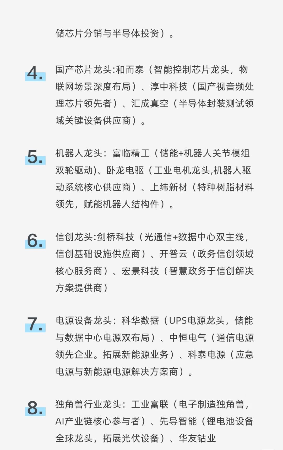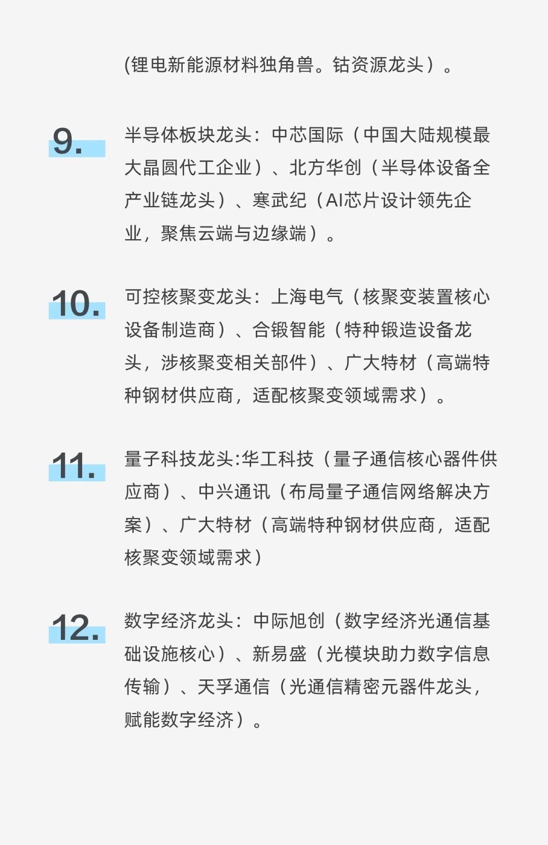 当前科技行业多个细分领域的龙头企业和核心竞争力,具体内容如下: 第一张图聚焦科技大牛市下的三大热门赛道龙头: - 算力概念龙头:中际旭创(全国光模块龙头,800G/1.6T产品出货量领先)、中科曙光(国产算力基础设施核心供应商)、新易盛(光通信模块领域技术与出货量双优); - 消费电子龙头:工业富联(全球电子代工巨头,AI服务器核心制造商)、立讯精密(消费电子精密制造龙头,布局汽车电子)、长盈精密(消费电子连接器龙头,拓展新能源领域); - 存储芯片龙头:江波龙(存储模组龙头,兼顾消费级与工业级市场)、德明利(存储控制芯片及解决方案领先企业)、香农芯创(聚焦存储芯片分销与半导体投资)。 第二张图扩展至更多科技细分领域,列举8个方向的代表性企业: - 国产芯片:和而泰(智能控制芯片龙头,物联网场景深度布局)、淳中科技(国产视音频处理芯片领先者)、汇成真空(半导体封装测试关键设备供应商); - 机器人:富临精工(储能+机器人关节模组双轮驱动)、卧龙电驱(工业电机龙头,机器人驱动系统核心供应商)、上纬新材(特种树脂材料领先,赋能机器人结构件); - 信创:剑桥科技(光通信+数据中心双主线,信创基础设施供应商)、开普云(政务信创核心服务商)、宏景科技(智慧政务与信创解决方案提供商); - 电源设备:科华数据(UPS电源龙头,储能与数据中心电源双布局)、中恒电气(通信电源领先企业,拓展新能源业务)、科泰电源(应急电源与新能源电源解决方案商); - 独角兽行业:工业富联(电子制造独角兽,AI产业链核心参与者)、先导智能(锂电池设备全球龙头,拓展光伏设备)、华友钴业(锂电新能源材料独角兽,钴资源龙头)。 第三张图进一步补充了4个前沿科技领域的龙头: - 半导体板块:中芯国际(中国大陆规模最大晶圆代工企业)、北方华创(半导体设备全产业链龙头)、寒武纪(AI芯片设计领先企业,聚焦云端与边缘端); - 可控核聚变:上海电气(核聚变装置核心设备制造商)、合锻智能(特种锻造设备龙头,涉核聚变相关部件)、广大特材(高端特种钢材供应商,适配核聚变领域需求); - 量子科技:华工科技(量子通信核心器件供应商)、中兴通讯(布局量子通信网络解决方案)、广大特材(高端特种钢材供应商,适配核聚变领域需求); - 数字经济:中际旭创(数字经济光通信基础设施核心)、新易盛(光模块助力数字信息传输)、天孚通信(光通信精密元器件龙头,赋能数字经济)。 综合来看,以上覆盖了从传统强势赛道(如算力、消费电子、存储芯片)到新兴前沿领域(如可控核聚变、量子科技)的科技龙头,既包括各细分领域的绝对领军企业(如中芯国际、中际旭创),也包含跨领域布局的综合型科技巨头(如工业富联),为投资者了解科技行业头部格局提供了清晰的参考框架。