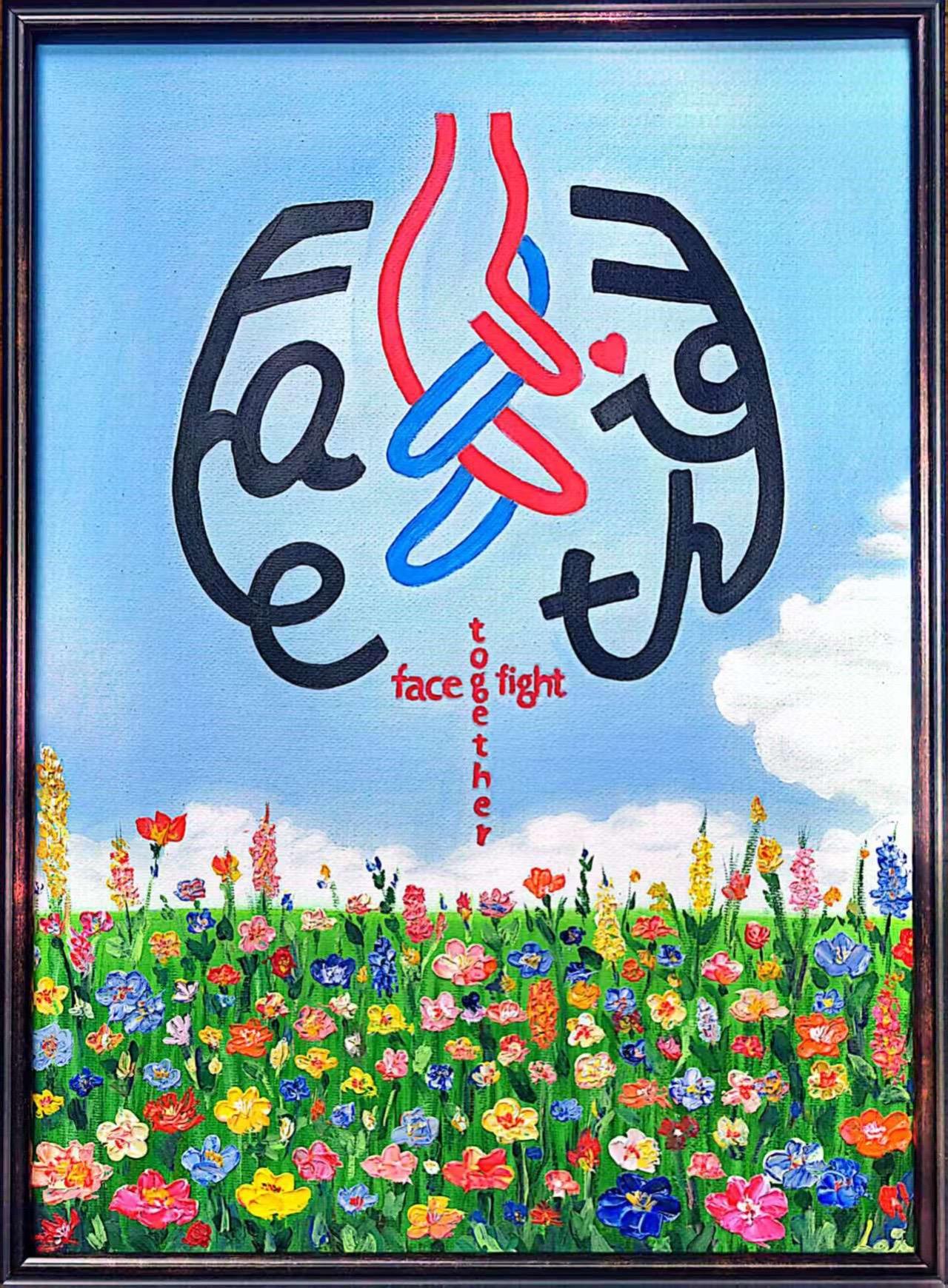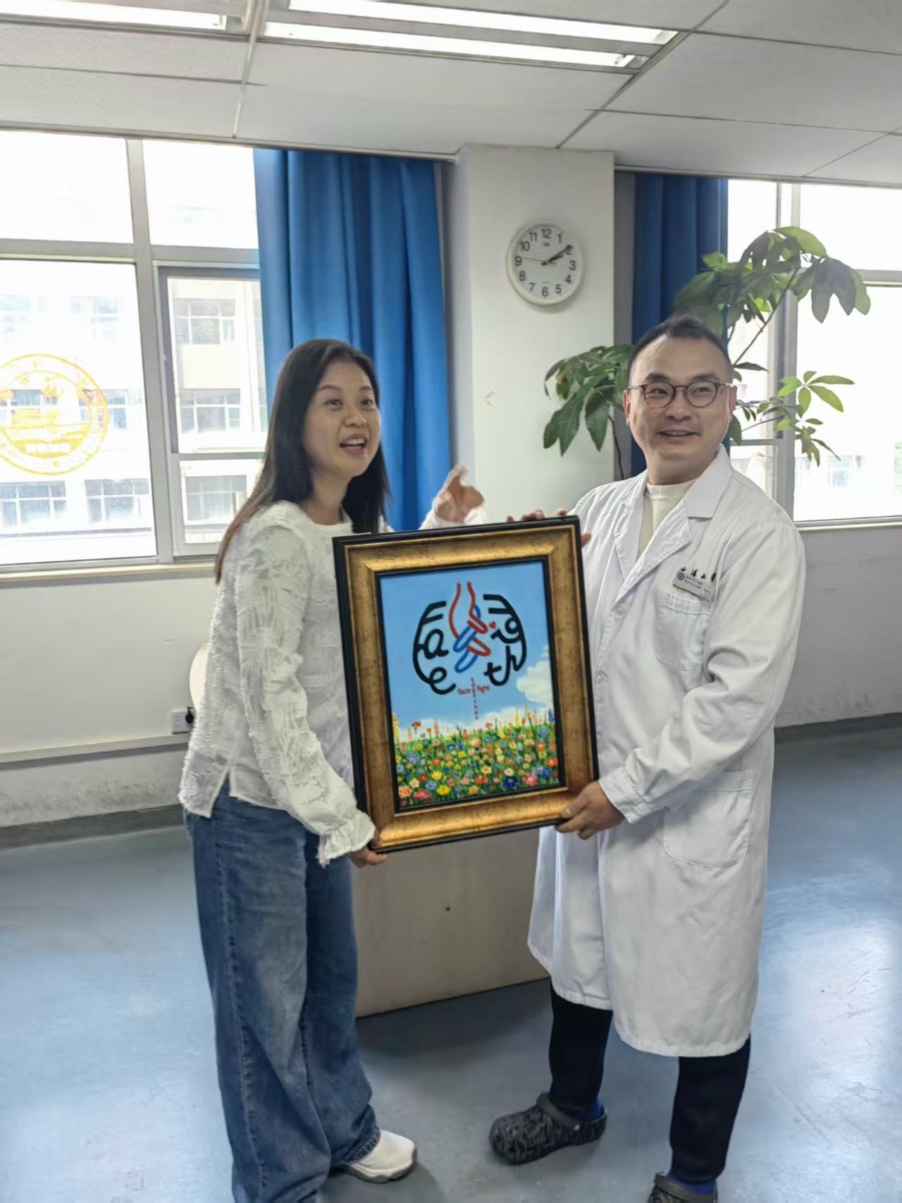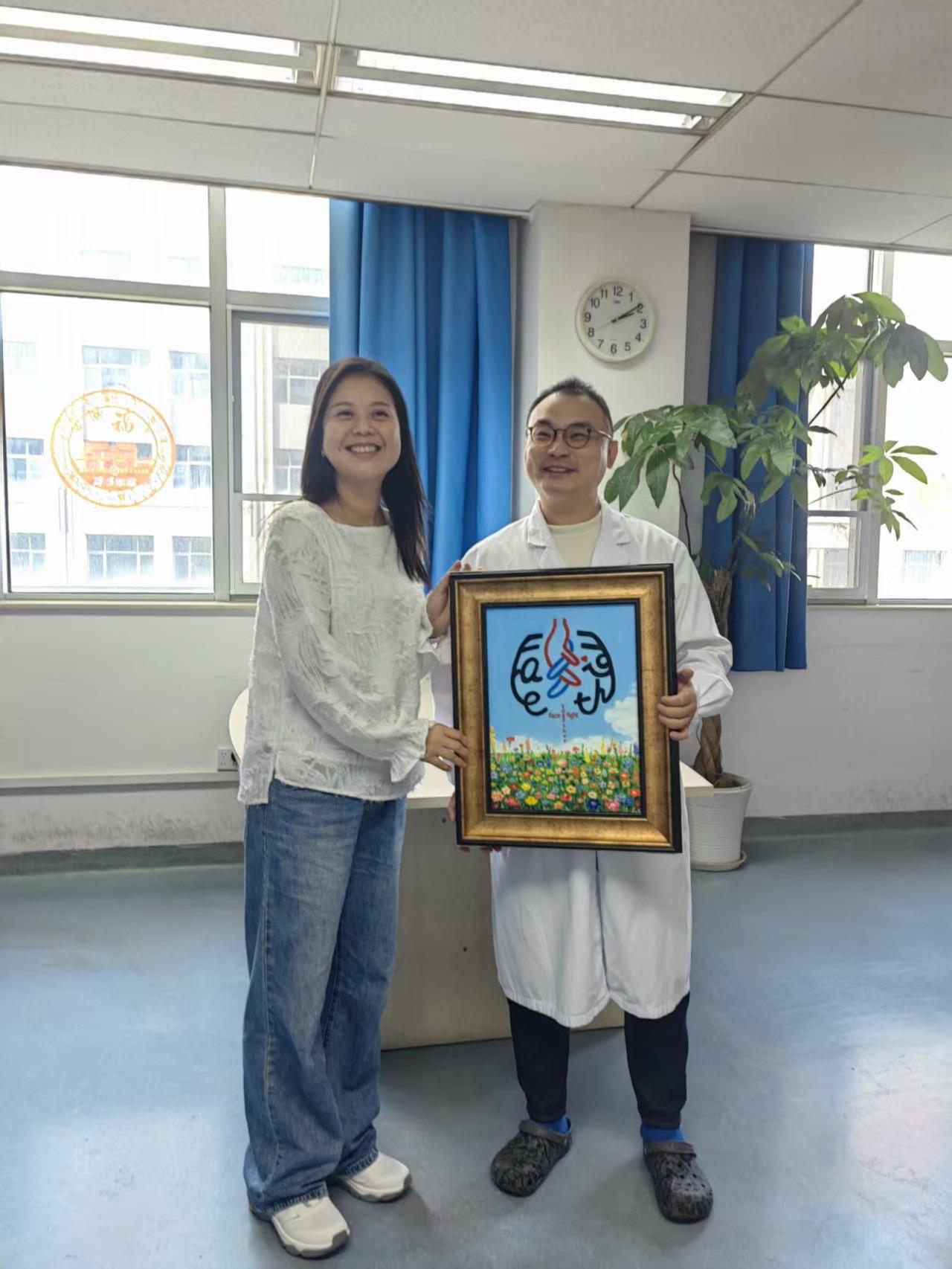 美女同学的画作。是同学,也是患者家属。把我设计的科徽画成了油画。整个科徽由一个肺样的图形构成,左边是face,右边是fight ,中是医护的手和患者的握在一起组成一个支气管的形状。寓意是,在艰难的时候,医护和患者一起,共面面对,共同战斗