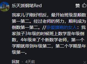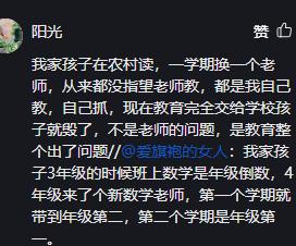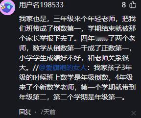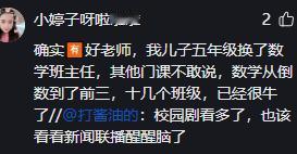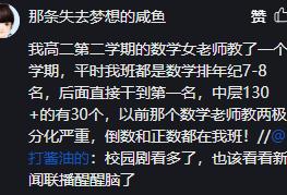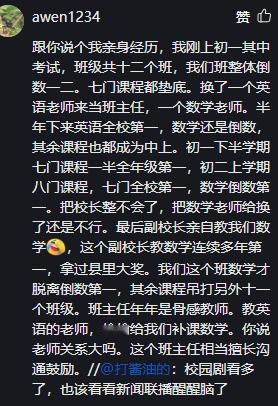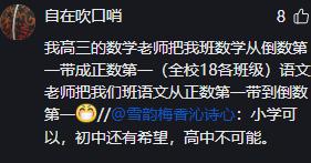 网友1:没有笨学生,只有笨老师! 网友2:换老师后,班级大逆袭! 网友3:从倒数变成正数! 网友4:一开始第一第二,经过老师的努力,后来倒一倒二 ———————— 我的分析: 班级大逆袭的情况, 1、最常见于小学,初中少见,高中更少见。 2、通常发生在教育薄弱地区,特别是班级人数少的地区。(这是这2个条件,相关性很强) 3、通常只是一个科目大逆袭!很少见到全科的! ———————— 创造出教育神话的老师,很多时候其英雄事迹仅仅是昙花一现。有人注意过,教育神话出现的条件么? 有不少教育神话发生在“重点高中重点班”……一旦换个人接手这样的班……所以创造神话的老师,容易换人…… 极少数教育神话不是发生在优质生源的地方!又或者说已经远远超越那种生源应该有的水平,但那通常会伴随着极大的代价。 一般的老师,由于种种原因,是无法长期付出那种代价的! 曾听过一对教师夫妇,一起去支教,拼命教,教学成绩斐然,然后功成身就,急流勇退,回城养病。 我这曾有一个名师,拼出了一次耀眼成绩,各种荣誉到手。在这之后,长期住院养病,好像说有半年……要知道,他当时还是尚未成家的青壮年! 为什么这些神话往往昙花一现? 参考这2个案例,应该不难想象了。 教育神话中,也有常青树——张桂梅老师。 至于她付出的代价,大家自己去查吧! 家庭?金钱?个人时间?身体疾病?