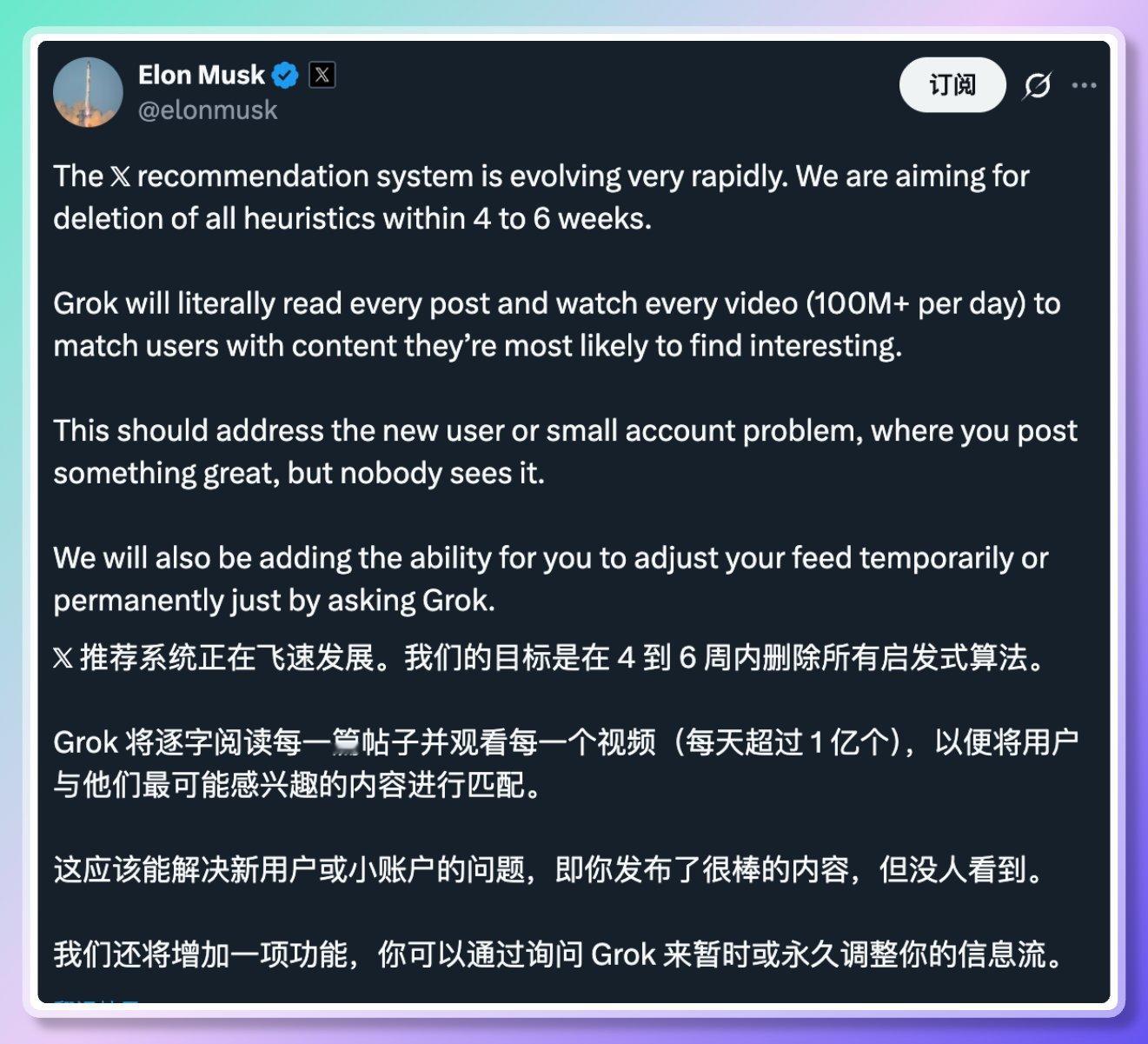 ——X平台的推荐系统将通过Grok实现重大升级,计划在4到6周内移除所有启发式算法。