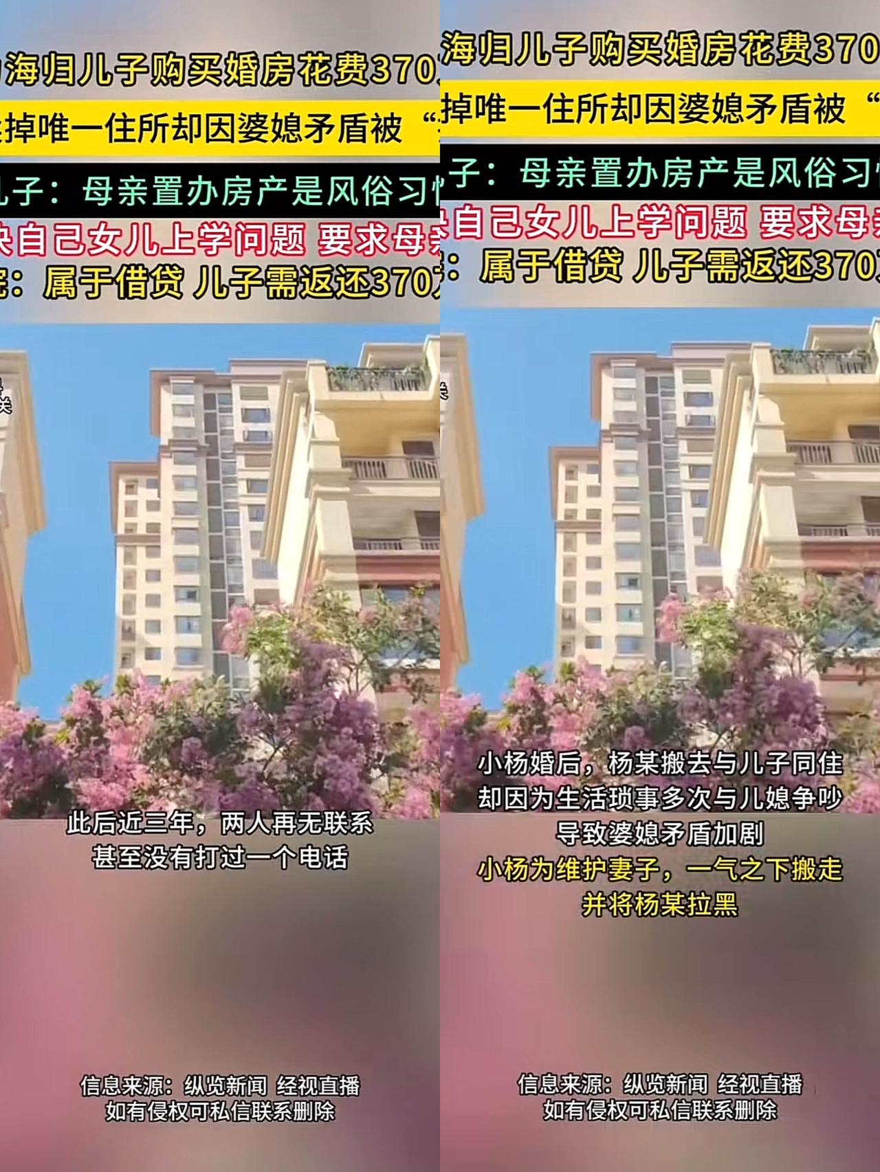 这个新闻看了让人心情挺沉重的!! 这位单身母亲,为了儿子的婚房问题, 卖掉了自己名下仅有的一处房产,前前后后一共花了370万,为她的儿子置办了婚房。由于她的房子已经卖掉了,儿子婚后,她也理所当然的住进了儿子的这个新家。 结果住进去没几天,就被儿媳以“婆媳矛盾”赶人,连留过学的儿子都帮着媳妇,说“为女儿学习”让妈搬走,还觉得这一切都是当妈的该做的! 这哪是养儿子,简直是养了个“白眼狼”!法官判返还370万算是给了公道,但这颗被伤透的心怎么补?其实根本不是不能对孩子好,而是别把“付出”当赌注,总想着掏心掏肺就能换养老无忧。 父母的爱该有底线,不是无底线的牺牲自己! 通过这件事大家应该明白一个道理,抚养孩子是法定的义务,但真没必要对他们掏心掏肺的付出,因为你的真心未必得到好报!