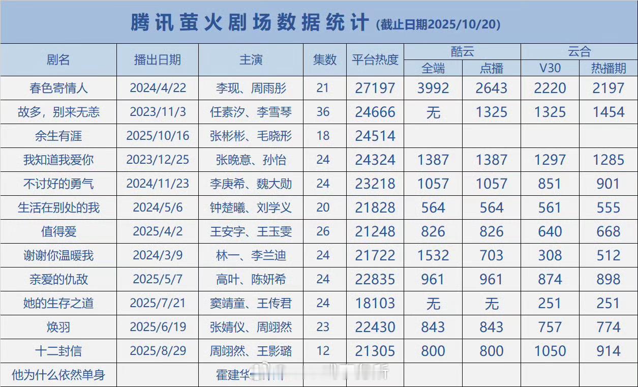 🐧萤火单元已播出12部剧,目前为止热度和播放量的断层纪录依然是李现周雨彤的《春色寄情人》。