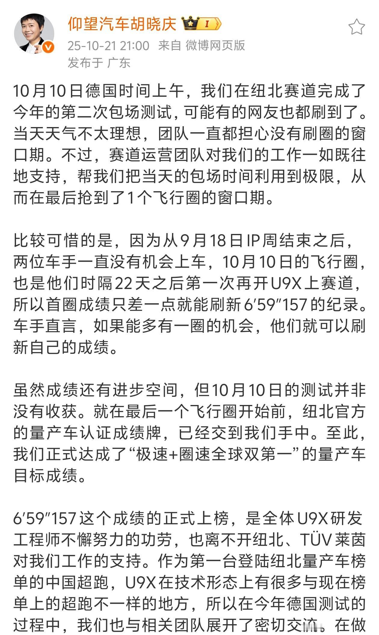 仰望U9 Xtreme在纽北的圈速成绩,正式被官方认证了,目前在量产电动车中排在头名。最终成绩为6分59秒157,起码在量产的电车中还没有比它更快的。 量产的意思很明白,不包括那些专门为这条赛道打造的用来刷成绩的车。因为那些车不会对外出售,多少有点自娱自乐的意思。 仰望U9X此前也以496.22km/h打破了极速纪录,包括油车和电车,没有比它更快的了。 仰望U9X进行了两次纽北包场测试,第二次因为天气原因和时间紧凑的因素没有打破第一次的成绩,比较遗憾。说实话这台车理论上还有更高的上限,后期如果还有机会的话,可能还会刷新圈速,只不过就要付出更高的测试成本了。 仰望U9X采用1200V高压平台,配备4个30000转电机,最大马力超过了3000Ps。同时有云辇-X等悬架控制技术,还有佳通定制半热熔轮胎,这个轮胎的上限在500km/h。另外像车身也做了特殊轻量化处理,悬架用上了航空级铝材。 目前来说,这台车就是能代表比亚迪最新技术成果的产品,全球限量只有30台。 不知道大家对此怎么看?【来自懂车帝车友圈】
