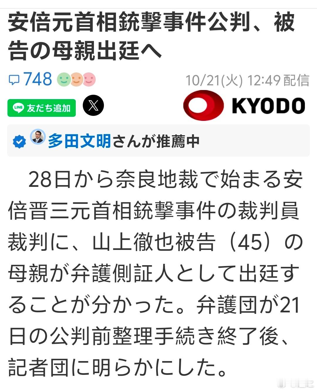 28日,日本奈良地方法院将会公开审理刺杀安倍晋三的山上彻也。山上的辩护律师提交了他的母亲作为证人。