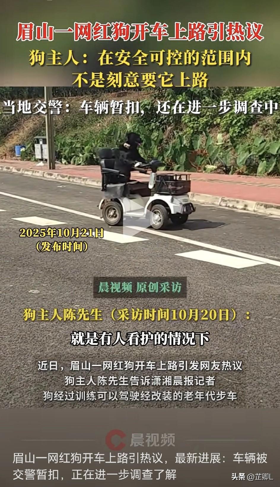 “狗开车上路”惊现四川眉山街头:网红猎奇无底线,谁为公共安全买单?网红猎奇的遮羞布,遮不住漠视生命的荒唐! “我的狗会开车!” 这句话听起来像天方夜谭,却在四川眉山真实上演。 10月18日,四川眉山,有网友拍到一条黑色的拉布拉多犬独自驾驶电动车在公路上行驶。 视频中显示狗狗“正襟危坐”,前爪握方向盘,边开车边吠叫,引发了网络热议。 而狗主人回应,自己很委屈,很憋屈,如果自己犯法,自己愿意承担!凭什么马拉车、牛拉车可以,狗开车就不行了? 据称,这条拉布拉多犬是一条网红犬,狗主人起初是训练它滑滑板车,后来看到国外有狗开车的,刚好有人送了一辆老年代步车,自己就开始训练狗开车。 考虑到狗不会踩刹车,车辆是经过改装的,断电即刹车。 平常狗狗都是在训练场训练,当天因为带狗狗去学开叉车,才在马路上开了一会,自己全程陪同。 目前涉事车辆因对交通安全有隐患,已经被暂扣,交警也明确指出,狗开车上路是不被允许的!若在封闭场所训练,也需要经过批准。 这样狗开车上路的事,交警也是第一次遇到,目前事件还在调查中,暂没有最终的处理结果。 而狗主人一个劲地喊冤,一番“强词夺理”,看似有理,实则漏洞百出,将他的侥幸与无知暴露无遗。 但广大网友并不买账: “车是给人开的,不是给狗开的。路是给人开车走的,不是给狗开车走的。你让狗开车上路影响到交通公共安全了,不违法吗?” “你的狗有驾驶证吗?” “真出了事故,你会站出来承担吗?” “好多事情不是不让你承担,是怕你承担不起!” “扣车是对的,对人的生命不负责!” “马拉车、牛拉车,也别委屈,它俩开车也不行。” “危害公共安全!” “可以在你家院子里开,别出门别上路。” “马拉车,驾驶的还是人啊。” “哪儿学的?有驾照吗?学交规了没?” “你犯法你愿意承担,狗犯了法,你会替它承担吗?” “现在的网红越来越不正常了!” 网友的最后这一句“现在的网红越来越不正常了”,点出了整件事情的真谛! 网红经济走到现在,真的是越来越不正常了,就连曾经高高在上的明星,也一个个走向了网红的路线,衣着装扮、行为举止也越来越网红化。 让狗独自开车?可真能想的出来,如果发生交通意外,如果撞伤了人,狗主人还会高喊自己负责任吗? 别说是狗,就连未成年开车都是不被允许的,更何况是狗! 四肢行走的动物,你非得要它像人一样直立坐下来,两只前爪握住方向盘,它的爪子上的指头能握住方向盘?遇到意外知道避让?能懂得交通法规? 这纯粹是拿着路上行人的性命,来满足他猎奇赚取流量的目的。 此举不仅仅是漠视他人性命,漠视动物的安全,更是对法律的践踏。 在任何情况下,让狗开车上路都是绝对违法、极度危险且不负责任的行为。 这不仅将狗置于极度危险之中,也严重威胁到道路上其他车辆和行人的安全。 而狗主人的行为根本不是爱狗,而是在虐待狗,违背动物的意志和生长规律,妥妥的虐待行为! 大家怎么看?一起来聊一聊吧! 信息来源于潇湘晨报,侵联删!