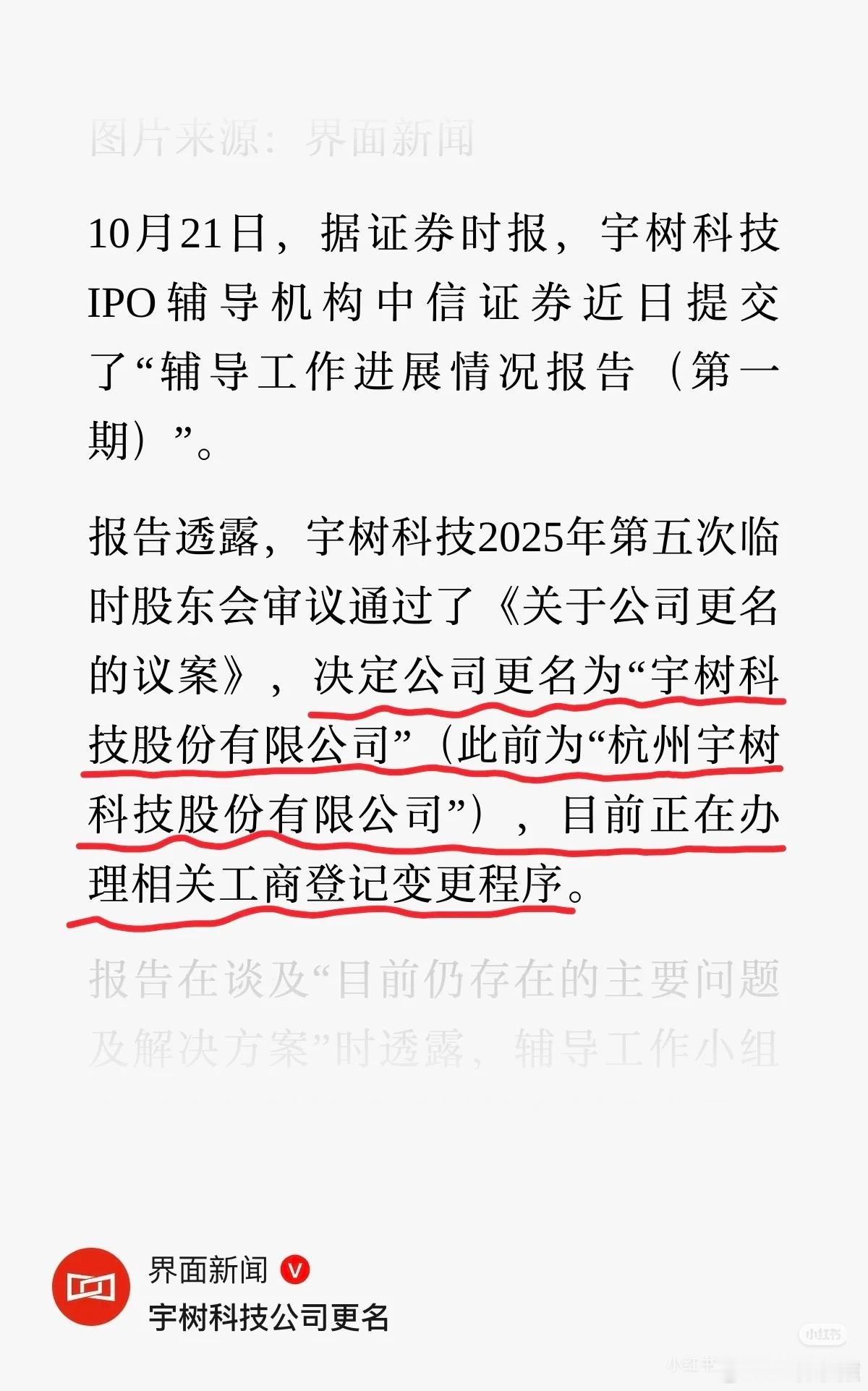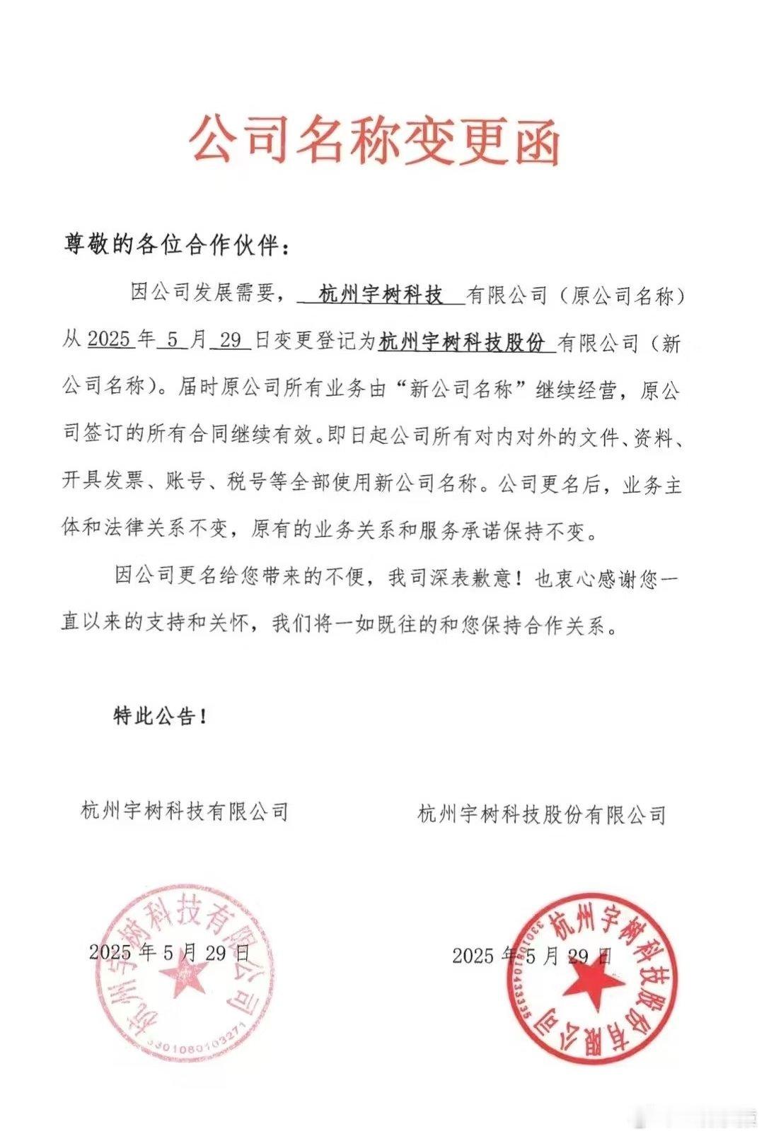 宇树科技决定更名这是宇树科技第二次改名了,之前从杭州宇树科技有限公司改名杭州宇树科技股份有限公司,现在改名为宇树科技股份有限公司,要走向全球化了。[good]