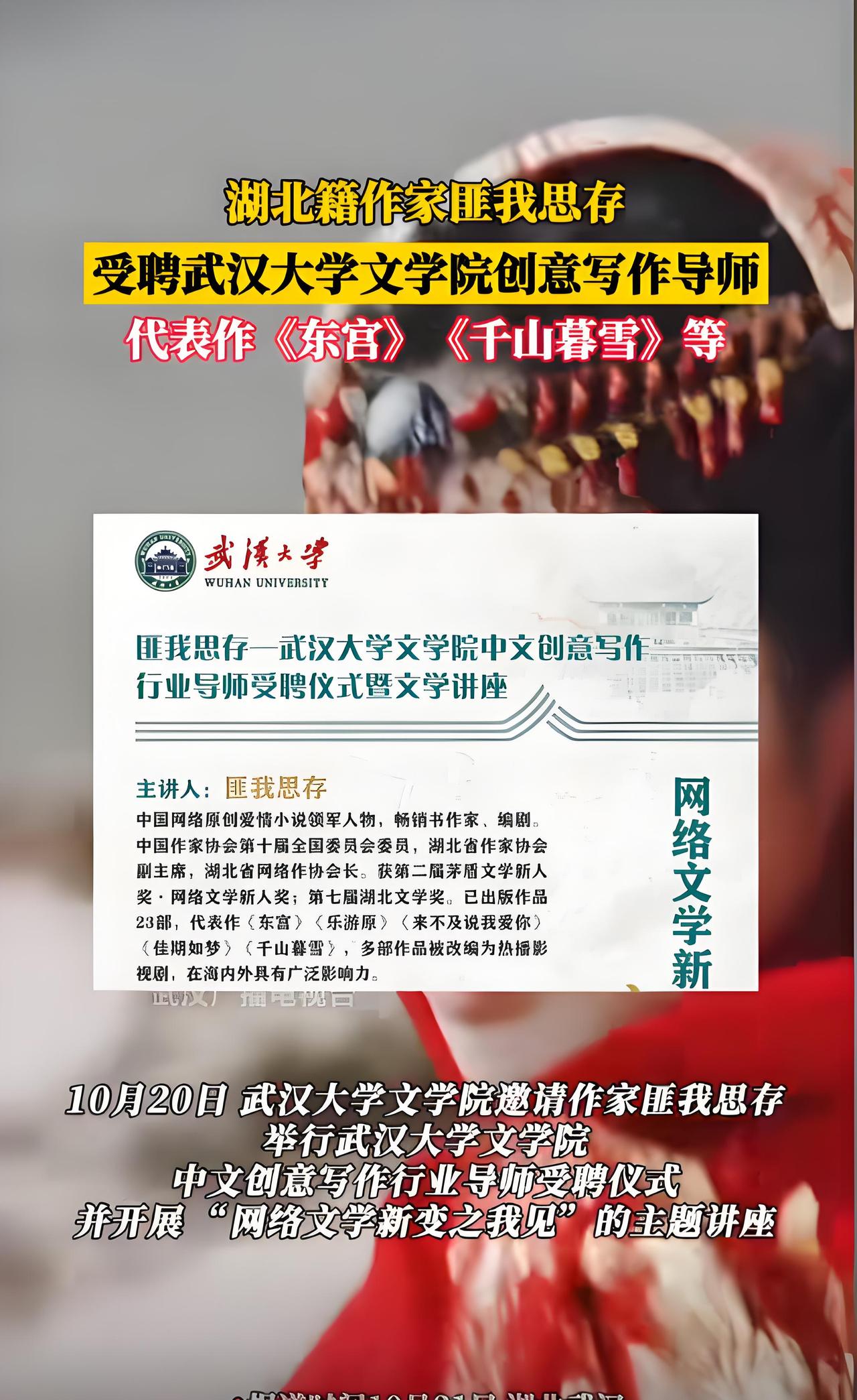 网络文学进高校:匪我思存武大开讲,是破圈还是噱头? 匪我思存受聘武大导师,看似是网络文学与传统高校的“破圈联姻”,实则是文学教育一次值得肯定的供给侧改革。当不少人还在争论网络文学是否“登得大雅之堂”时,武大已敏锐地捕捉到时代脉搏:文学教育不能只啃“故纸堆”,更要直面千万读者真实的文化消费现场。匪我思存带来的不仅是《东宫》《千山暮雪》等过亿播放的IP运营经验,更是对“Z世代”读者情感结构的精准把握——这种市场洞察力,恰恰是传统学术圈最稀缺的资源。 有人认为此举是“向流量低头”,但恰恰相反,这可能是对文学精英主义的一次祛魅。网络文学早已不是“套路化爽文”的代名词,如《天才基本法》融合学术竞赛与成长叙事,《大国重工》承载工业历史,其题材深度与社会关怀正在拓宽文学边界。匪我思存在讲座中强调“不被流行风潮左右,坚持自我表达”,正是对创作初心的回归——这种兼具艺术追求与市场验证的视角,将为学术研究注入活水。 当然,融合之路需避免“唯流量论”。理想的状态是既借行业导师打破学院派的“信息茧房”,又用学术训练提升网络文学的叙事格局。当创意写作教育能同时传承鲁迅的批判精神与理解“弹幕互动美学”,才是真正意义上文学教育的升维。