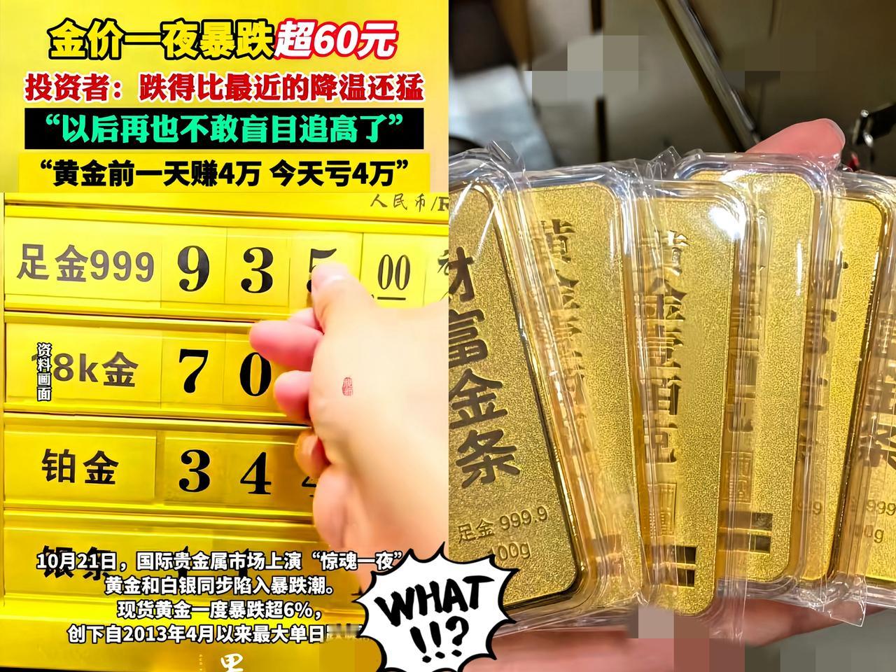 天塌了, 金价一夜暴跌! 就昨晚21点半到22点,那价格 跟坐过山车似的! 我昨天才头一回买,今天眼睁睁看着金价从963一路跌到945。中间还傻兮兮地在963时5000块5000块地加仓,最后加到动弹不得,只能看着又暴跌600块,先前1000块盈利瞬间没了! 这暴跌是大资金获利了结,金价涨太猛嘛,换谁都想先落袋为安。很多新手像我一样,犯“越跌越补”的错,没搞懂金价上涨逻辑。机构觉得长期看央行增持黄金方向不变,回调是机会,但不能瞎操作! 投资风险大,不能盲目跟风,得提升认知。 你们觉得呢?