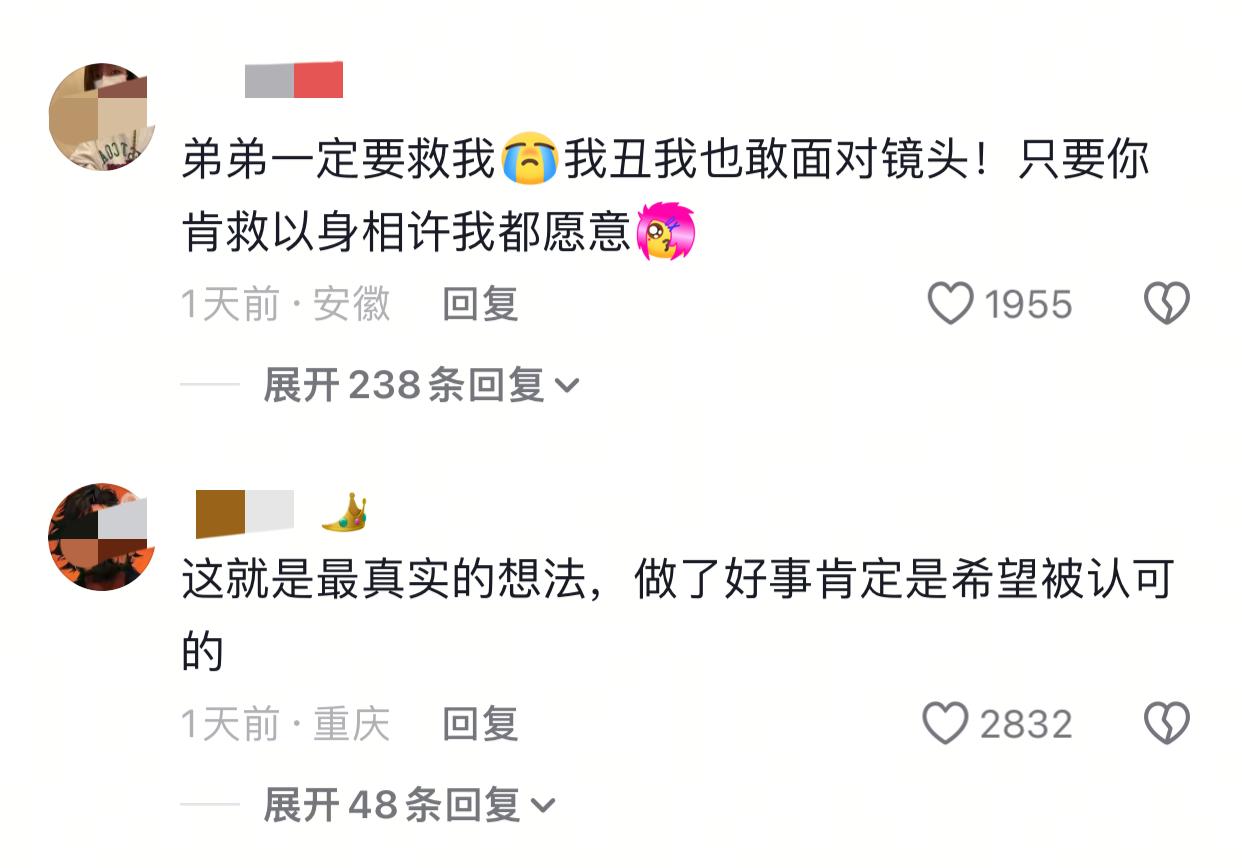 风向真的不太对,小仙女落水被救,见义勇为的王先生对着镜头自我反省,他以为做了好事可以留名,万万没想到小仙女拿着肖像权讲道理,虽然救了人,但不能发出来……有人说王先生动机不纯,是为了自己能火,也有人认为只要真冒着危险把人救了,就有资格炫耀,做好事留名甚至得到好处,才会让更多人愿意去做。