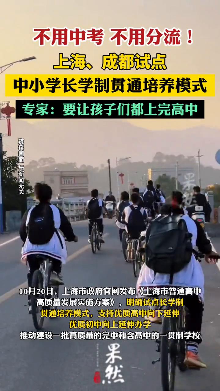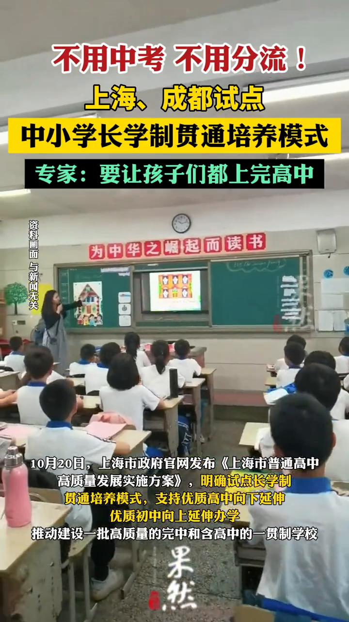 不用中考不用分流!上海、成都试点中小学长学制贯通培养模式。专家:要让孩子们都上完高中。 果然。 10月20日,上海市政府官网发布《上海市普通高中高质量发展实施方案》,明确试点长学制贯通培养模式,支持优质高中向下延伸,优质初中向上延伸办学,推动建设一批高质量的完中和含高中的一贯制学校。 《实施方案》提及发展科学高中,高标准规划、新建一批科学高中或十二年一贯制学校(或完全中学)。据此前报道,成都市自2025年10月起探索开展"小初高"十二年贯通式和"初高"六年贯通式培养改革试点。首批参与试点的学校共8所。 据中国新闻周刊封新闻报道,比如上海财经大学滴水湖高级金融学院院长姚洋将人才的选拔交给高考,一直在呼吁取消中考,要让孩子们都上完高中,到时候再决定去学技术还是上大学。