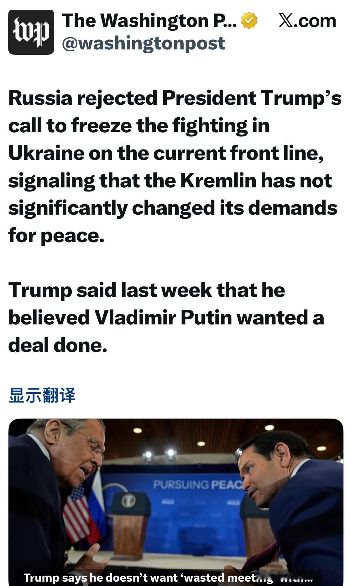 俄罗斯拒绝了特朗普总统关于冻结乌克兰当前前线战斗的呼吁,这表明克里姆林宫对和平的要求没有发生重大改变。 特朗普上周表示,他相信弗拉基米尔·普京希望达成协议。