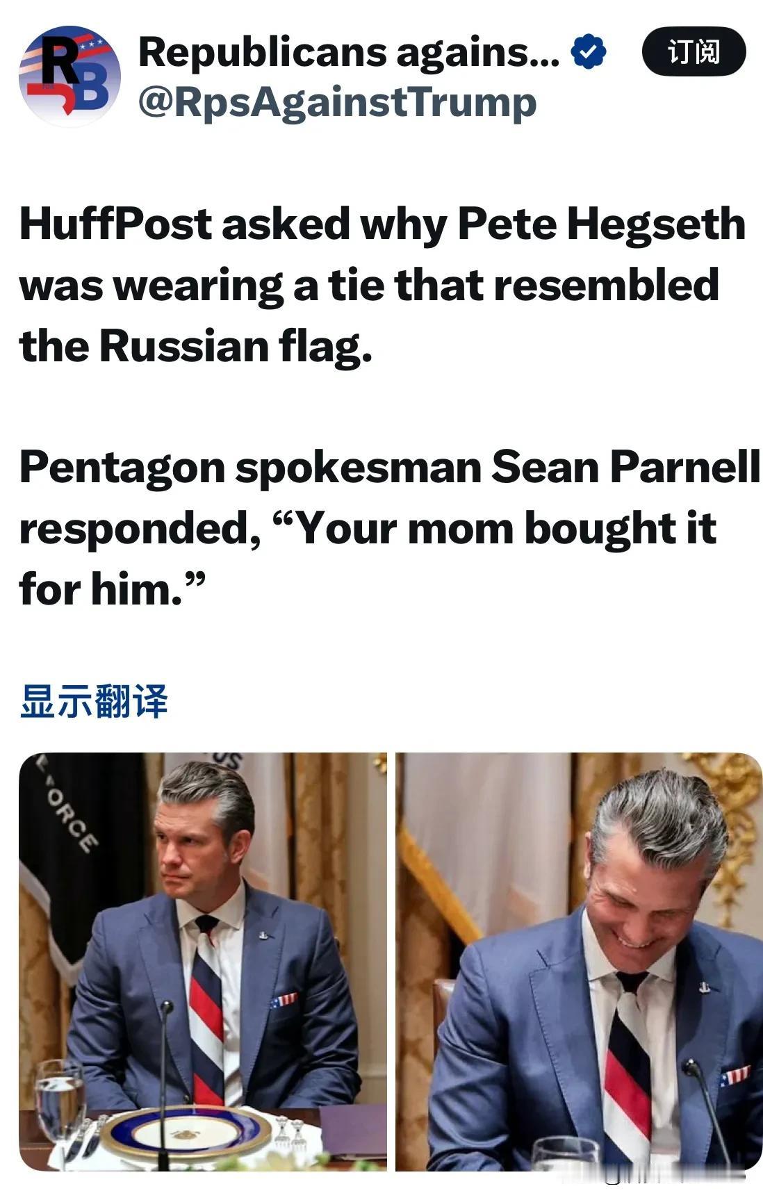 哈弗珀斯特问为什么哈格塞斯要戴着一条仿俄罗斯国旗的领带。五角大楼发言人肖恩潘回答说: “你妈给他买的”。