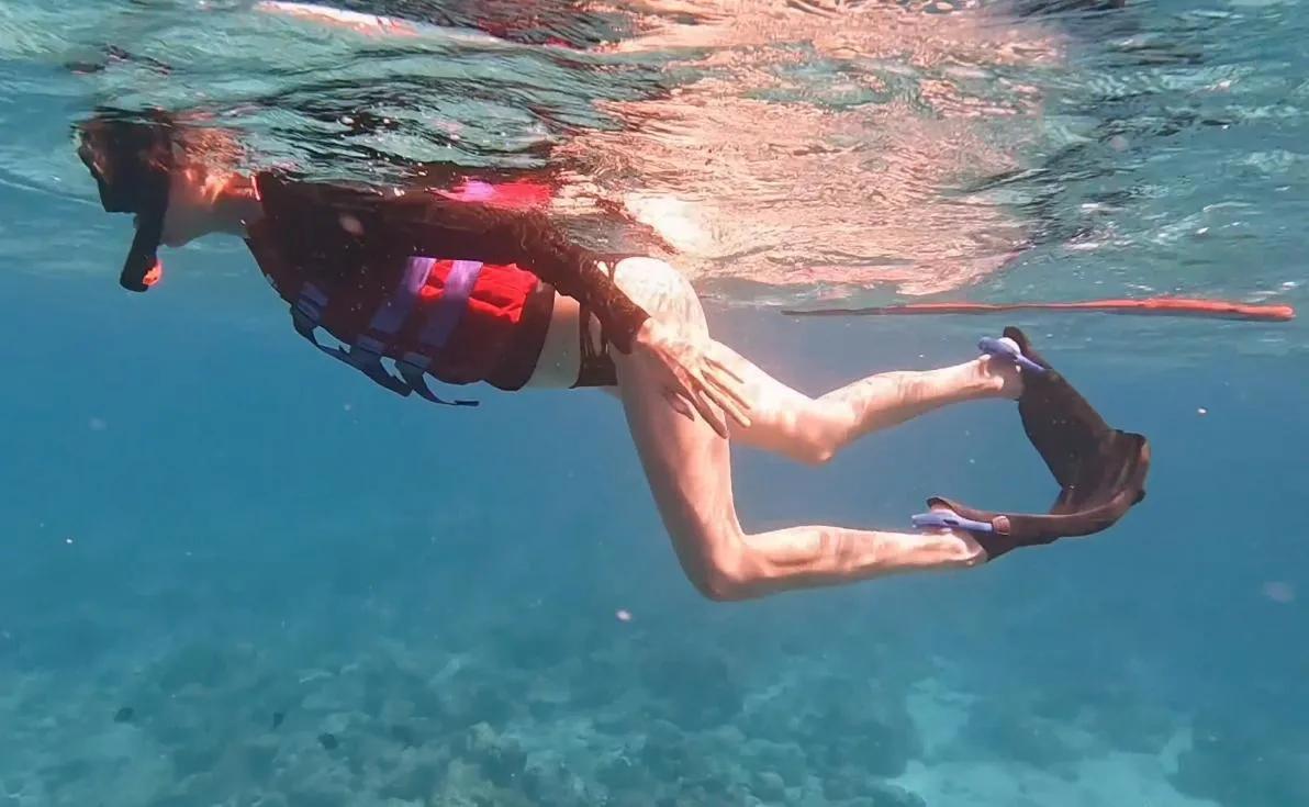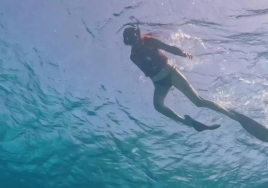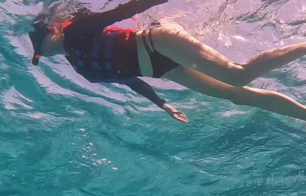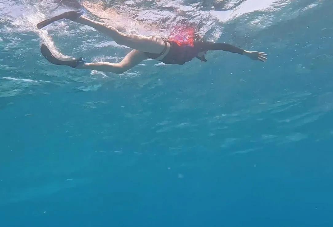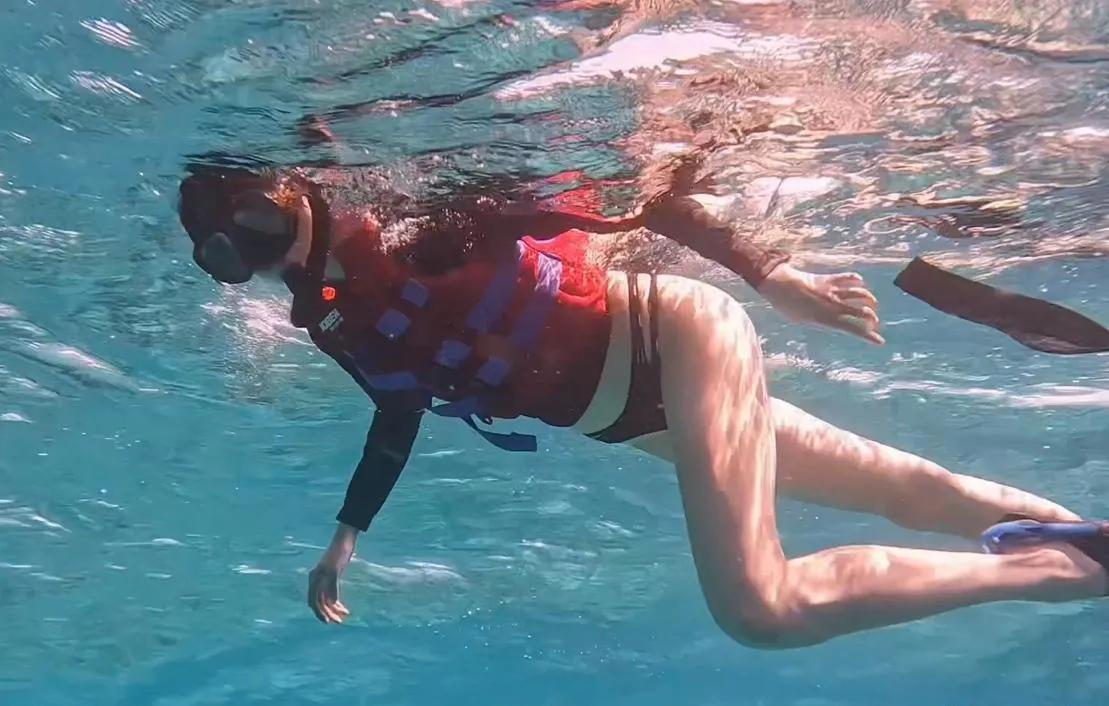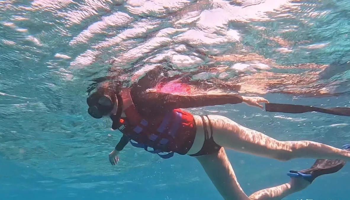 关晓彤晒出马尔代夫度假vlog,视频里她穿着泳衣出海浮潜,在清澈的海水中,那双腿