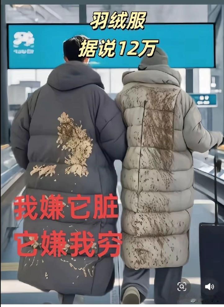 活了大半辈子了, 没见过这么埋汰的人儿! 一后背的泥汤子都发霉了还敢穿出门。 凑近一瞧,哎哟,差点闹笑话。 原来两人羽绒服后背上那大片看似泥土加发霉的印子,竟是设计!现在的服装设计师,脑洞真是越来越大,这种新奇设计,有人欣赏也有人愿意掏钱。 敢把这“极易被误会”的衣服穿出门,那得超级自信才行。瞧瞧那后背,乍一看像沾了一身泥,细看才发现是精心设计的图案,深浅不同的泥土色搭配出独特效果。 不得不说,这设计确实特别又艺术,可我呀,还真有点欣赏不来,感觉跟不上这潮流咯。像这种“远看像脏污,近看是艺术”的设计,大家能接受吗?要是你们,有勇气穿出门不?