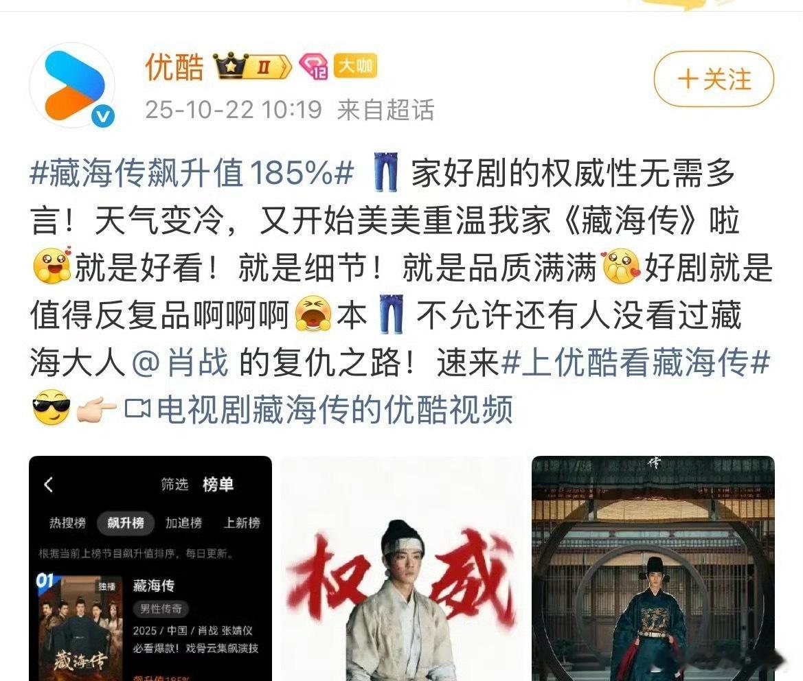 红果日活已经超过优酷,这下谁真“扛剧”、谁是“虚火”,流量生花们来优酷播部剧就见真章了[酷] 。说起来,真扛剧扛招商的肖战,《藏海传》能在优酷破各种纪录,拿下热度史冠,今年唯一破30亿播放量的剧!广电认证剧王,火爆全球🌍,简直是👖“定海神针”般的存在 。