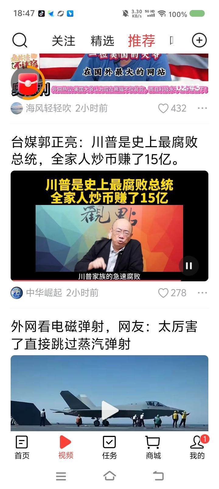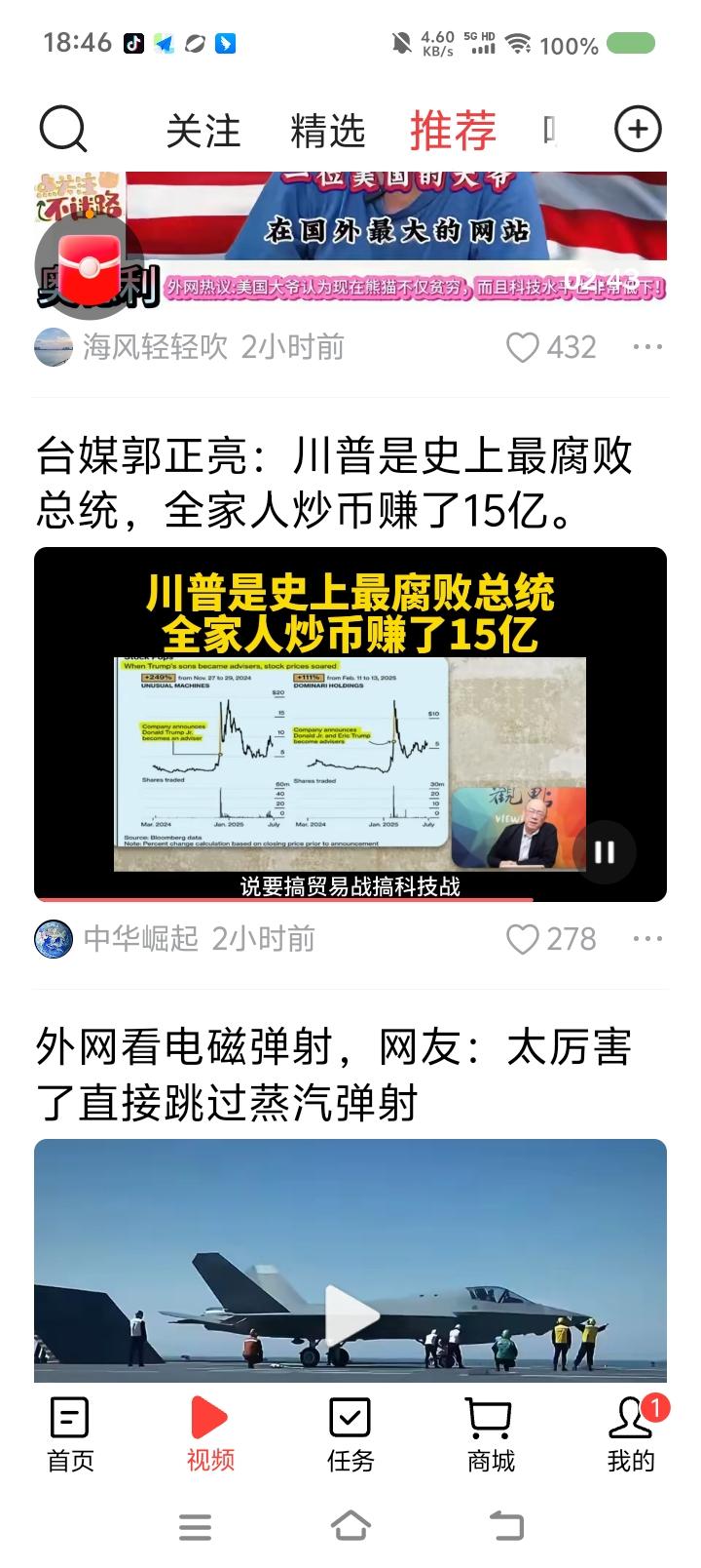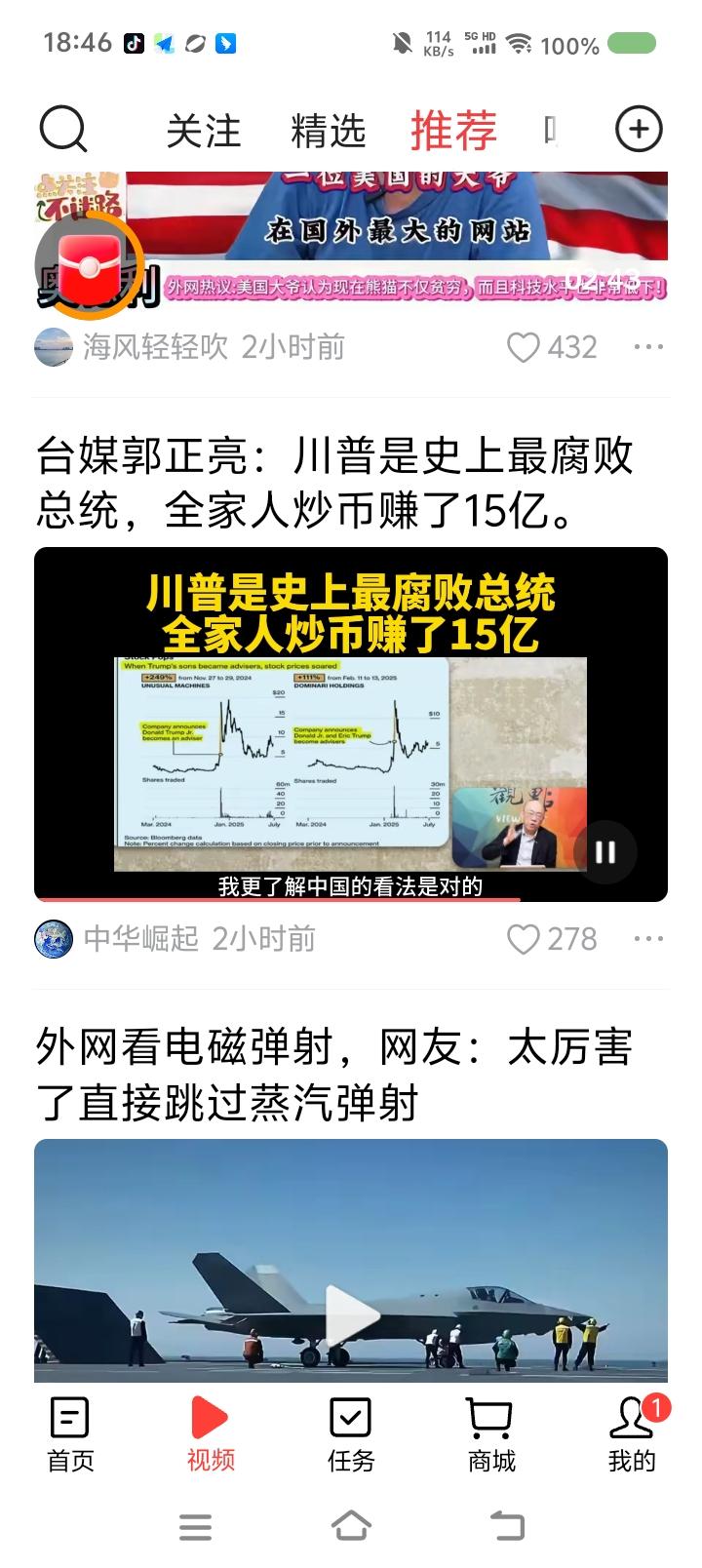 特朗普是最腐败的总统?—— 节目里,台湾省郭正亮说:“特朗普是最腐败的总统,家人炒币获利15亿美元,而且特朗普集团发行一些虚拟货币,还有操纵股市之嫌……特朗普怎么会从国家利益角度打贸易战?都是为了家族赚钱。中国已看到这一点。” 点评: 如果属实,那对特朗普来说,家族赚钱第一,当总统是手段,是副业。他上任以来一切不专业和荒唐的行为可以解释了。