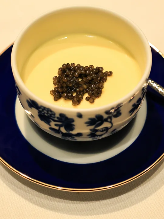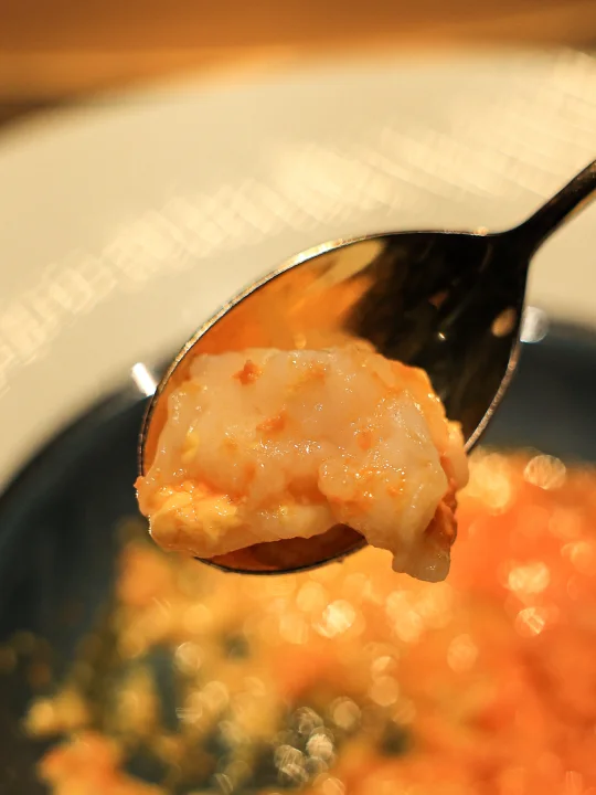虾油、虾脑做的虾酱盖在蛋羹上,每一口是原汤化原食的虾鲜。与蛋羹相比,过于溏心的虾球口感酒显得稍逊一筹。