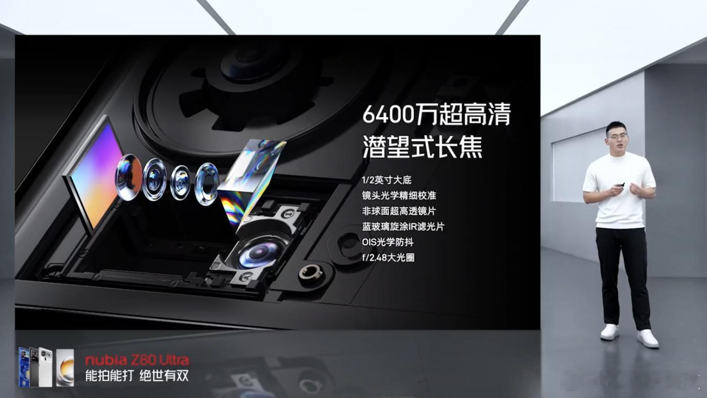努比亚Z80Ultra 与25mm主摄搭配的是18mm超广角主摄和6400万像素潜望式长焦镜头,这枚长焦镜头还支持了长焦微距和AI长焦多帧超分