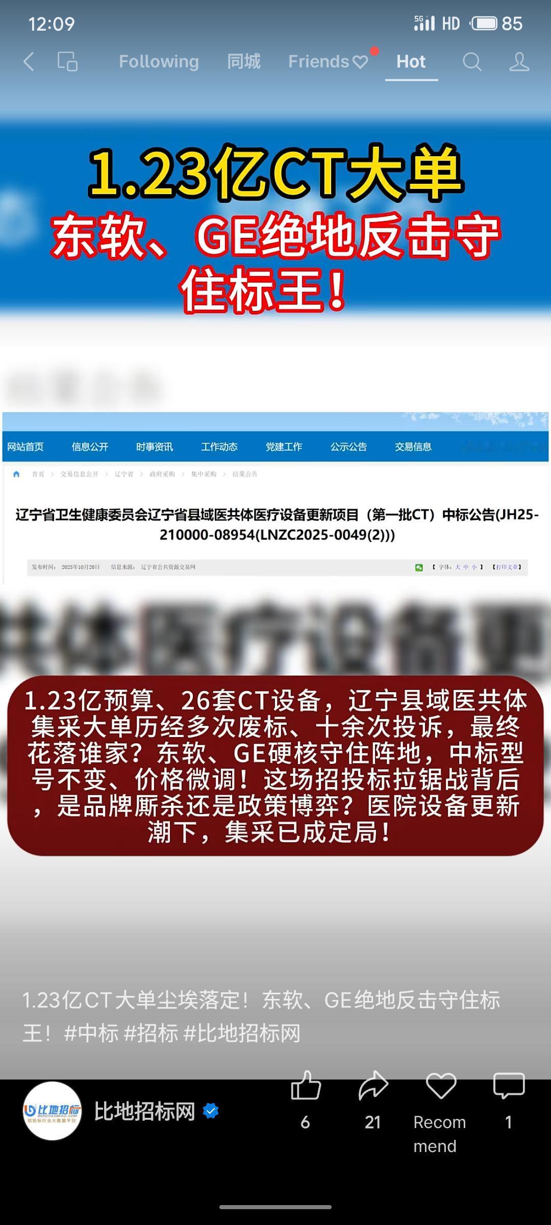 辽宁省县域医共体1.23亿元CT设备更新大单历经波折,最终由东软与GE中标,在多次废标与投诉后成功守住核心份额。