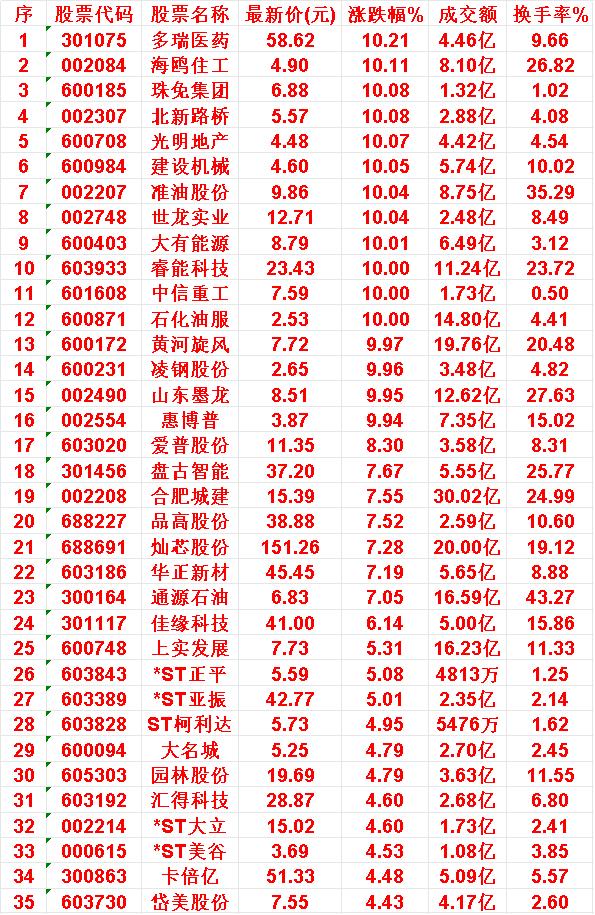 10月22日,均线多头排列的35名单汇总 多瑞医药:最新价 58.62元,成交额 4.46亿元; 海鸥住工:最新价 4.90元,成交额 8.10亿元; 珠免集团:最新价 6.88元,成交额 1.32亿元; 北新路桥:最新价 5.57元,成交额 2.88亿元; 光明地产:最新价 4.48元,成交额 4.42亿元; 建设机械:最新价 4.60元,成交额 5.74亿元; 准油股份:最新价 9.86元,成交额 8.75亿元;