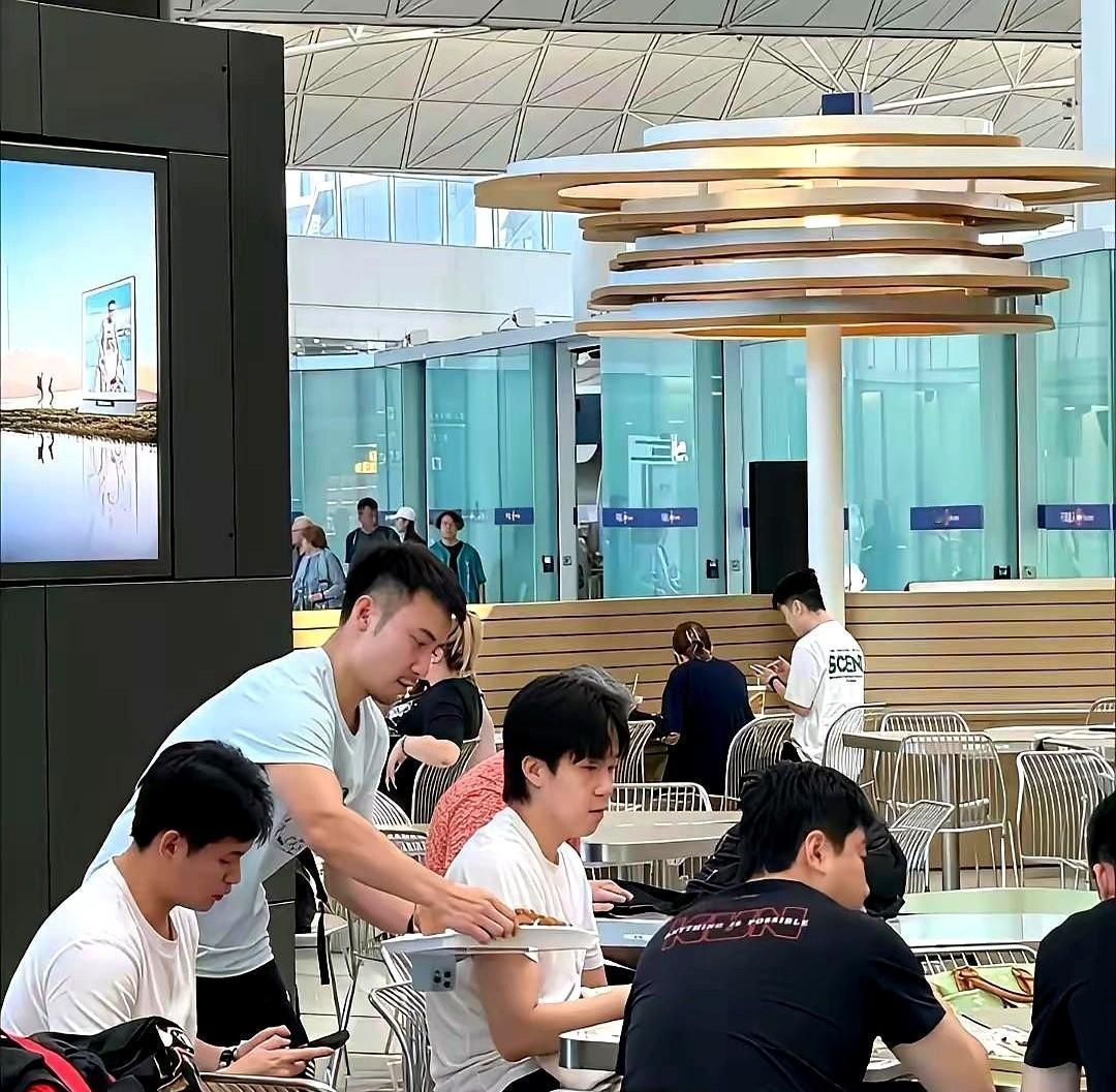 王楚钦今天在香港机场,刚结束训练比赛的小伙子们饿得狼吞虎咽。 王楚钦靠在椅子上