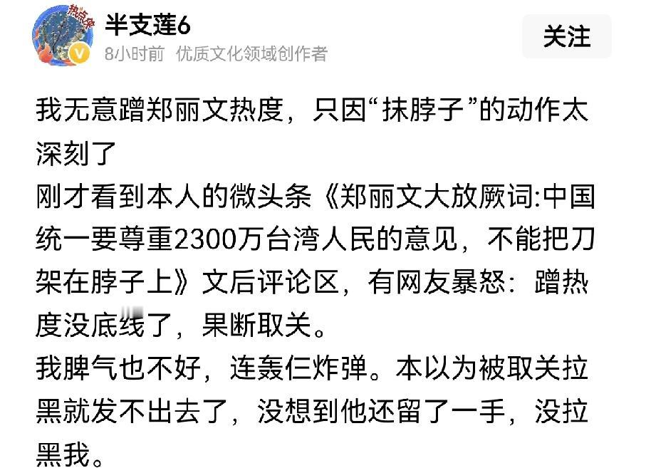 有一说一,单凭郑丽文的这个动作,我就十分的不放心 刚刚看了一篇短文,半支莲6写的,这让我又想起她这个动作。 如果有人说这是蹭流量,那就算是吧…… 但是,话该说的还是要说。 我向来认为,不经意间的动作,或者语言,最能反应出一个人的内心。 就拿郑丽文两三事儿来说,她想见高市早苗和这个抹脖子动作,就是内心流露。 当然,你可以不信,我们让时间来验证。 这里,我说两个题外话,用来佐证现在有人被带偏了。 一个是候友谊,这个新北市长,今天说了这样一段话: “按照一中宪法,坚持民主自由的生活方式,在宝岛这块地好好生活,这是我们的共识。” 他是在被问及“九二共识”时说的,你看出统一心态了吗? 我们继续看。 岛内有个与郭正亮交好的媒体人吴子嘉,他在郑丽文当选后的一个栏目中说,我们这一代,包括我,还基本认同我们是中国人。 但,下一代人,包括我儿子,他们不是,他们认为自己是“台湾人”。 看明白了吗? 这不是个例,这是他们内心的真实写照,这和蓝绿没关系。 诚然,我们希望他们改变,但是,这不等于说他们就会变。 新的蓝营一把手,会不会是又一个拖字诀? 我看就是。 所以,这让人十分不放心。再拖下去,他们承认自己是的这一代人已经不在了,下一代,可能吗?