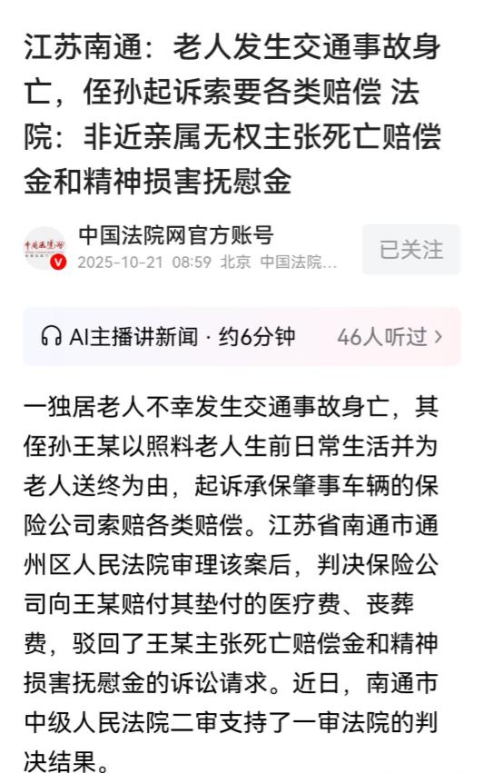 江苏南通,独居老人王某岗在骑电动车时与小轿车发生碰撞,不幸身亡。老人的侄孙王某,作为唯一与老人亲近的亲属,不仅承担了老人的医疗费用和丧葬费,还因情感和经济损失提出了赔偿诉求。然而,保险公司只同意支付医疗费和丧葬费,对于其他如死亡赔偿金和精神损害抚慰金的请求却予以拒绝,最终双方未能通过协商达成一致,王某将保险公司起诉。   王某岗老人年轻时家境贫困,因此错过了结婚的机会,尽管在晚年经济状况有所改善,但他依然选择单身,至死也未成家。年过七旬的他虽然拥有自家承包的土地收入,但生活简朴,独自一人居住。令他未曾料到的是,在2024年7月3日清晨,他骑电动车外出时发生了不幸,撞上了轿车,因伤势过重而不幸身亡。 王某是老人的侄孙,因住得近,多年来对老人照顾有加。事故发生后,王某第一时间支付了老人的医疗费用,尽管老人最终未能挽回生命,他依然为老人办妥了丧葬事宜。在王某看来,这些花费和付出,既是对亲戚的责任,也是对家族的照顾。然而,当王某向肇事方的保险公司申请赔偿时,他遇到了难题:保险公司同意赔偿医疗费和丧葬费,但对于死亡赔偿金和精神损害抚慰金的要求,保险公司一概拒绝。 根据交警部门的责任认定书,王某岗老人和轿车司机韩某负有同等责任。王某认为,自己多年来不仅在生活上照顾老人,事故发生后,他不仅支付了老人高昂的医疗费用,也承担了丧葬费用。这些费用他自己实实在在支付过,且有相关凭证。因此,王某提出要求赔偿医疗费、丧葬费、死亡赔偿金和精神损害抚慰金。经过多次协商未果后,王某决定将保险公司起诉。 法院在审理案件时发现,王某岗老人并无直系亲属,仅有王某一名侄孙。在法定的继承关系中,侄孙并不属于继承人范畴。因此,王某并不具备法定意义上的近亲属身份。根据《民法典》第1181条的规定,死亡赔偿金和精神损害抚慰金的请求权仅限于死者的近亲属。法院查明,王某和老人之间并非抚养关系,尽管王某曾提供过一定帮助,但这并未达到法律上“扶养”标准。 《民法典》对亲属关系进行了明确规定,尤其在涉及到死亡赔偿金时,明确表示赔偿金是给予死者近亲属的补偿,而不适用于疏远亲属。在此案中,王某虽有支付医疗费用和丧葬费的证据,但死亡赔偿金和精神损害抚慰金的赔偿需求因其法律关系的疏远而无法得到支持。 法院判决明确指出,死亡赔偿金是对死者近亲属因死亡导致的经济和情感损失的补偿,而精神损害抚慰金则是基于亲属之间的情感纽带来提供的一种精神安慰。王某虽然多次为老人提供照顾,且在事故后积极支付各项费用,但他并不符合“近亲属”的法律要求,因此无法获得这两项赔偿。 对于王某来说,尽管他尽心尽力为老人支付医疗费和丧葬费,但在法律上,他并未达到要求赔偿死亡赔偿金和精神损害抚慰金的标准。法院最终判决,保险公司应当赔偿王某实际垫付的医疗费和丧葬费,而其他的两项赔偿则不予支持。 这一判决引发了对“近亲属”的法律定义和实践中如何界定赔偿标准的广泛讨论。法律明确规定了亲属范围,但实际生活中,很多人可能因情感、照顾上的投入而认为自己有权得到赔偿。然而,法律的判定不仅仅看情感投入,更重要的是法律上明确的身份界定。王某的情况虽有情感因素,但他并未完全符合抚养和扶养的法律要求,因此无法主张死亡赔偿金和精神损害抚慰金。 总结来看,法律的严格性和公正性体现在对亲属关系的清晰界定,尽管王某在实践中为老人提供了长期照料,但他并不具备“近亲属”身份,因此未能获得死亡赔偿金和精神损害抚慰金。而对于保险公司来说,尽管存在拒赔争议,法院的判决仍然支持了其只赔偿实际发生的医疗费和丧葬费的主张。