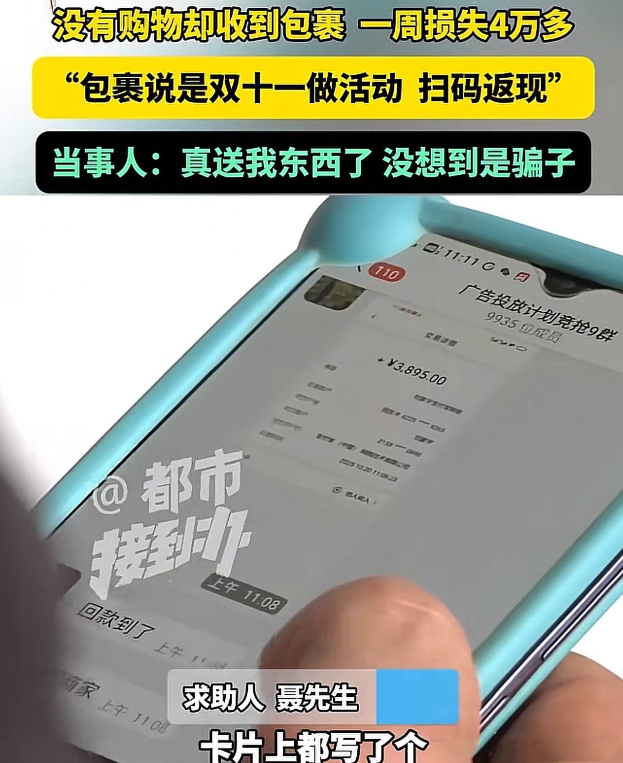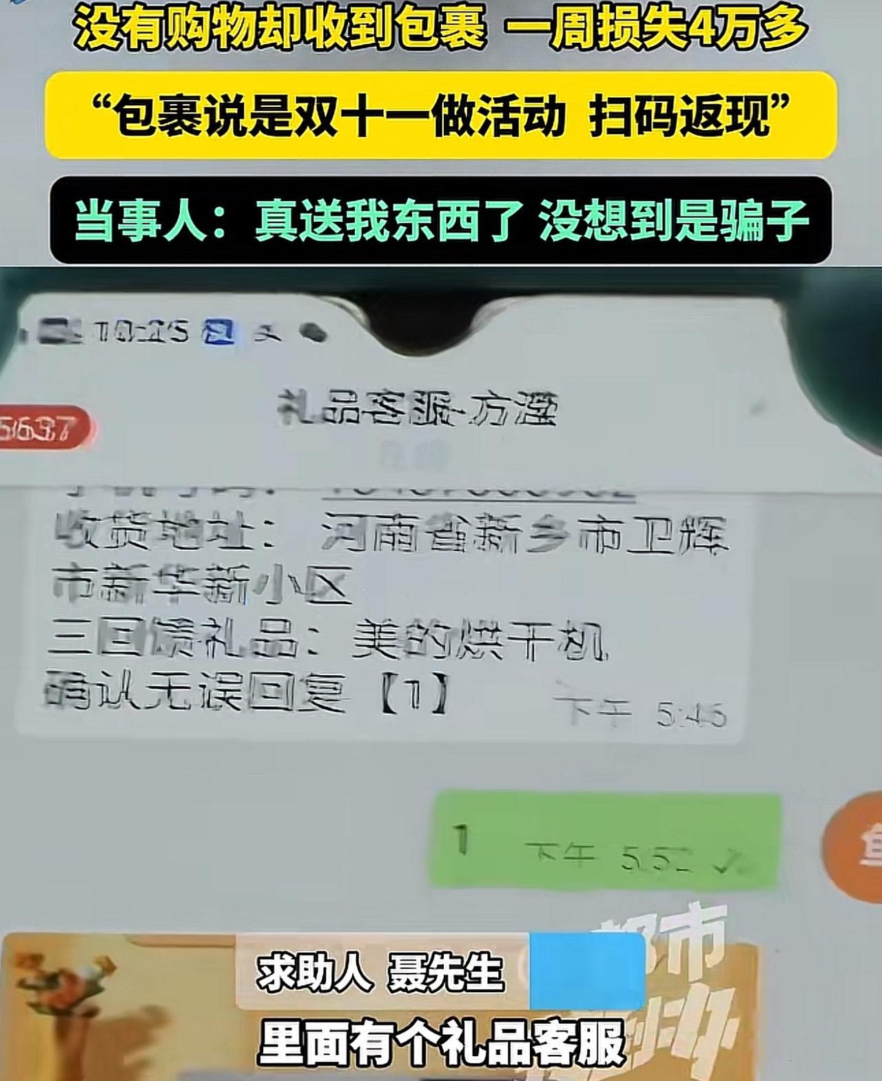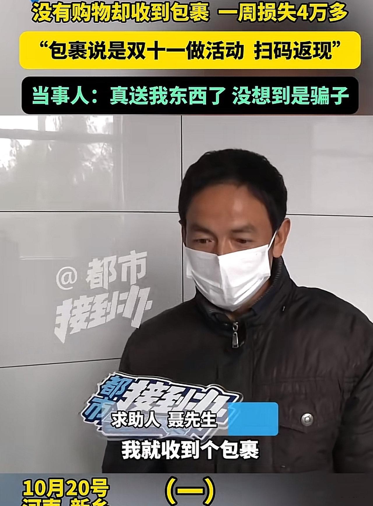 河南新乡,聂先生收到快递,看到上边扫码领现金,觉得有便宜可占,就扫了码,结果陷入