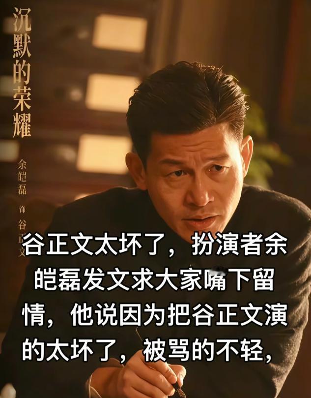敬业演员的烦恼。余皑磊把谷正文刻画的太逼真了!演技堪比当年陈强演《白毛女》中的黄世仁和李雪健演宋江一样,让观众恨得咬牙切齿。 遭骂引发的讨论能让演员的作品传播更广,收获更多观众!越是观众骂的狠,说明演员的表演功底越扎实,演技一流! 大众的骂,是演员演的角色!而不是演员本人!应理解!演技太到位了! 赞赏他的演技,一个非常优秀的好演员,就像丁勇岱演的白宝山一样,连警察同志遇到他都会下意识的掏枪! 这也是另一种“沉默的荣耀”,能把一个坏人演得让大家记住并且痛恨,也是作为演员的荣耀吧。 今天的影视界,能让观众记住的优秀反派演员,屈指可数,能把角色演绎成人人喊打,说明他成功了!
