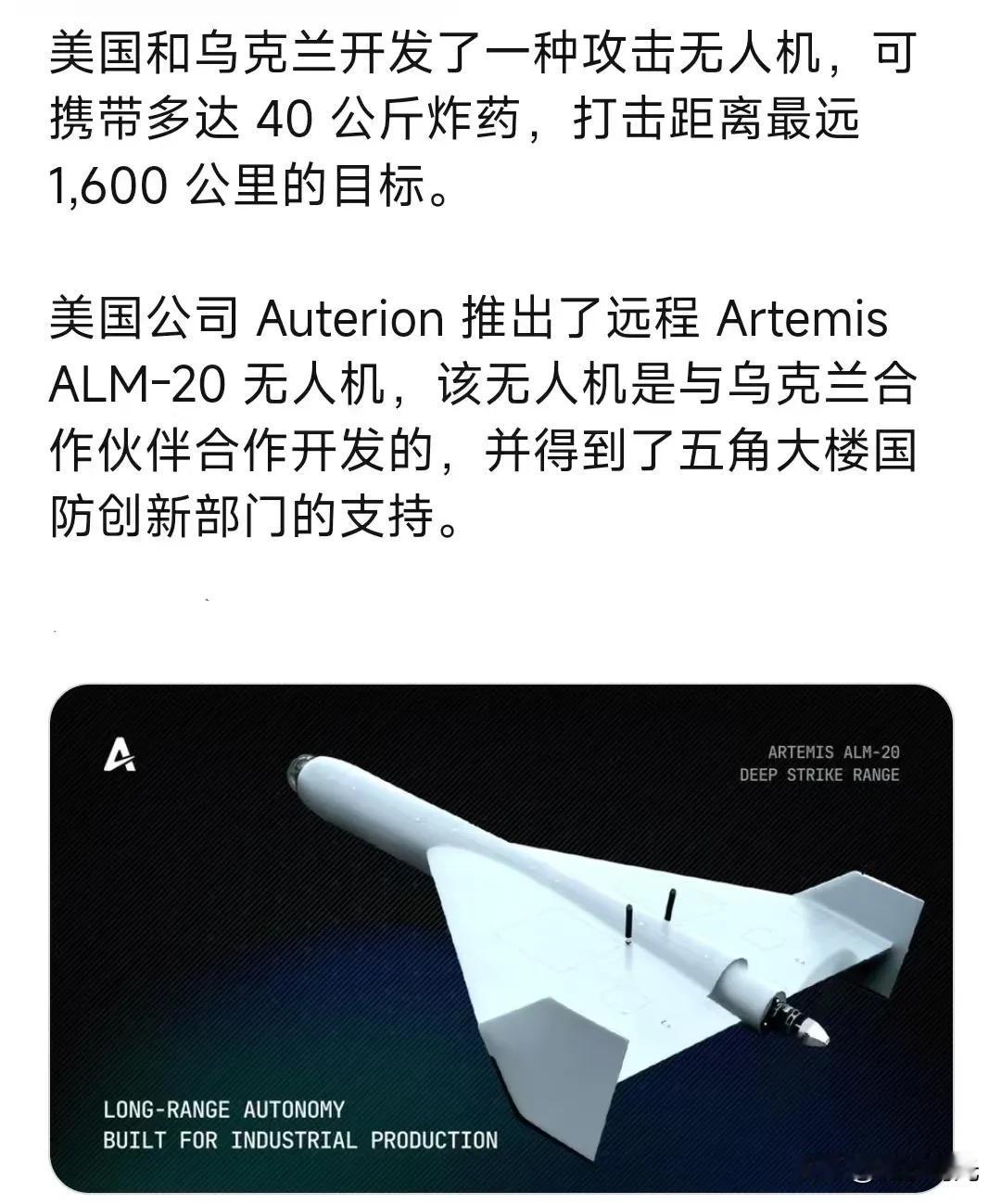 美国和乌克兰开发了一种攻击无人机,可携带多达 40 公斤炸药,打击距离最远 1,600 公里的目标。 美国公司 Auterion 推出了远程 Artemis ALM-20 无人机,该无人机是与乌克兰合作伙伴合作开发的,并得到了五角大楼国防创新部门的支持。乌军新型无人机