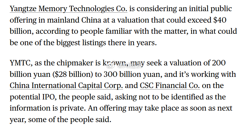 彭博:长江存储正考虑明年在中国内地进行IPO,估值可能在2000至3000亿元,这可能是内地近年来最大的IPO。