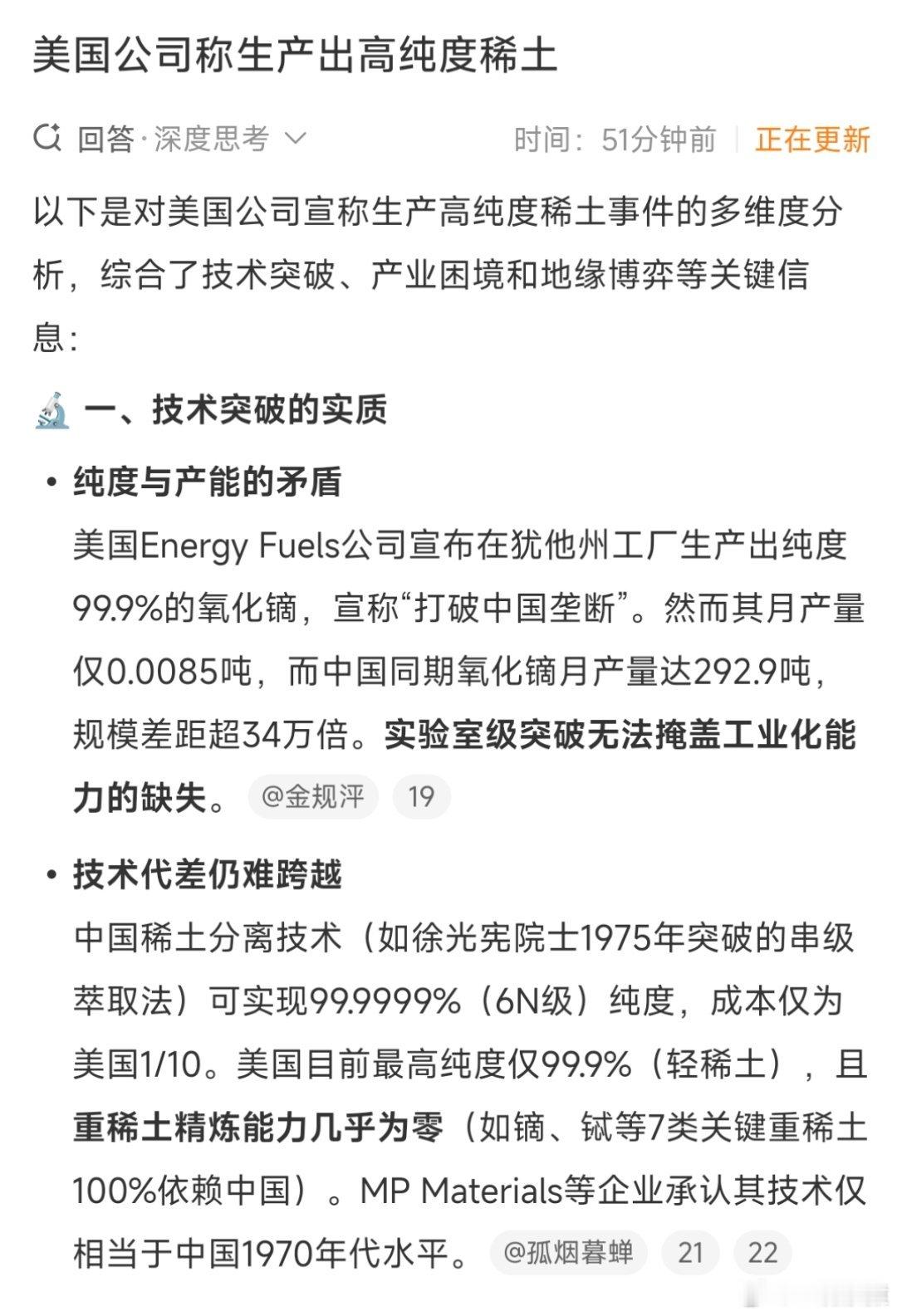 美国公司称生产出高纯度稀土月产量仅0.0085吨,而我们同期氧化镝月产量达292.9吨,规模差距超34万倍。[偷笑]