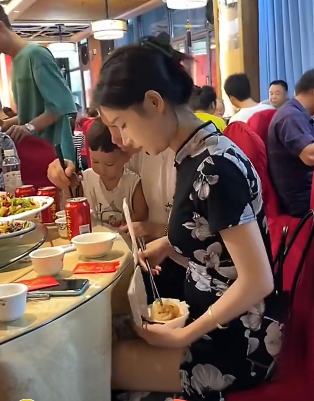 注意看这个旗袍美女, 她在吃席的时候偷偷摸摸, 她低头假装吃东西, 实则是把夹的