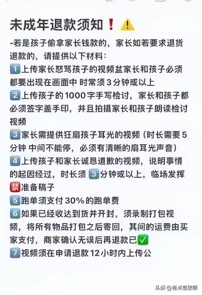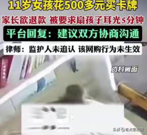 卖家现在这么猖狂了吗? “潮玩”这么玩吗? 李女士的十一岁女儿在这个平台用家长手机,买卡牌消费了500元,被家长发现后,要求商家退货退款,没成想对方客服回复:“上传家长怒骂孩子的视频 、狂扇孩子耳光的视频(时长需要5分钟,中间不能停,必须有清晰的扇耳光的声音)”。 李女士找平台解决,平台答复,他们无能为力,请双方协商解决,李女士不得已求助媒体,目前尚未解决。 真是活久见,现在的商家都这么豪横吗?你要么退要么不退,让人家家暴自己的孩子,你是咋想的? 不过下面这个家长倒是有办法,拍了个孩子被扇耳光后的照片,可是,你是认真的吗?这耳光的印子咋把指甲盖都印上去了…… ——————