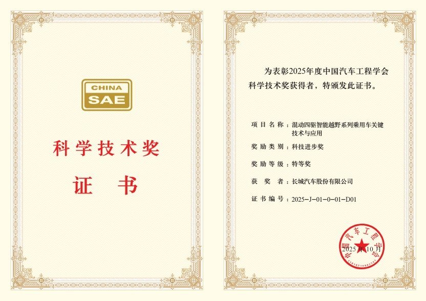 长城Hi4获科技进步奖特等奖 2025年10月,长城汽车《混动四驱智能越野系列乘用车关键技术与应用》项目荣获中国汽车工程学会科学技术奖“科技进步奖 特等奖”。这是该奖项设立30余年来首次颁发给混动技术,标志着行业对长城原创技术能力的最高认可。该奖项由国家科技主管部门登记授权,李骏院士领衔的专家委员会严格评审,体现了国家战略层面对混动技术创新的重视,同时,也展现出长城汽车坚持“长期主义”,持续自主创新的技术底蕴