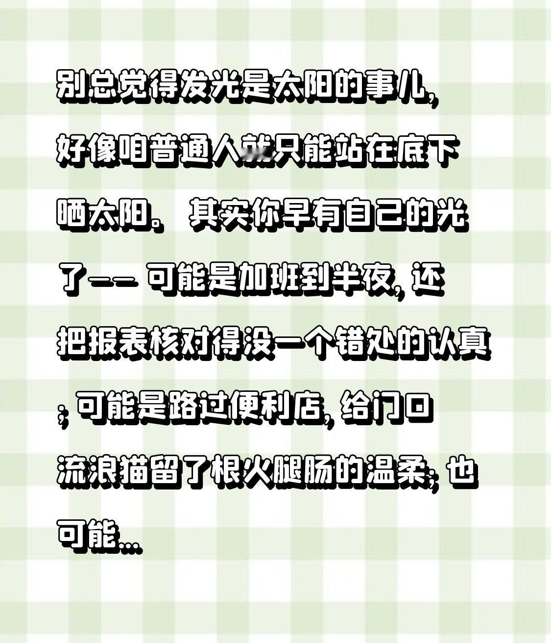 别总觉得发光是太阳的事儿,好像咱普通人就只能站在底下晒太阳。 其实你早有自己的光了—— 可能是加班到半夜,还把报表核对得没一个错处的认真; 可能是路过便利店,给门口流浪猫留了根火腿肠的温柔; 也可能是明明自己也难,却还帮朋友扛了半件行李的实在。 这些光没那么刺眼,却比路灯还暖。别总盯着别人的光芒慌神,你低头做的每一件小事,都是在给自己的光添柴火。 谁规定光只能是万丈的?你眼里的认真、心里的善良,都是独一份的光。 话说回来,你最近一次觉得自己在发光,是因为做了啥事儿呀?平凡中也有光 平凡的人会发光 平凡事物的光 这就是眼里有光 藏在平凡里的光 平凡者的光芒 平凡劳动者的光