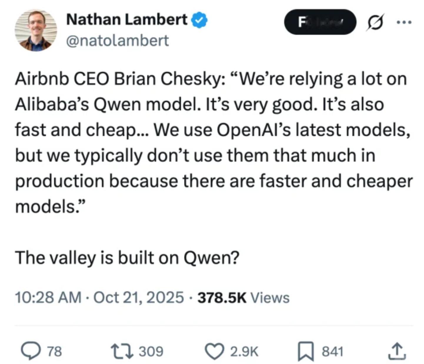 Airbnb CEO爆料:他们主力用的其实是阿里的Qwen大模型。理由很现实:又快又便宜,还好用。对于OpenAI 的最新模型,他们也在用,但生产环境几乎不上,因为又贵又慢。